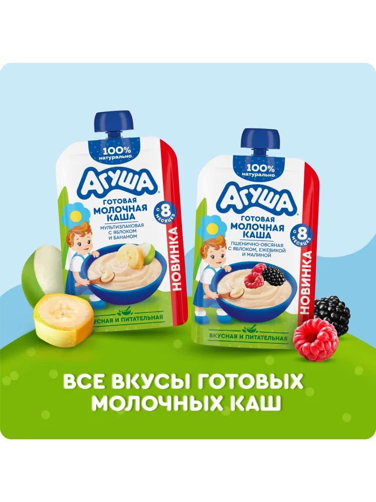 Новинка от Агуши – первая на рынке детского питания готовая молочная каша без варки - имеет 100% натуральный состав и содержит овсяные хлопья. Детская молочная каша от Агуша разработана специально для питания малышей от 8 месяцев.
