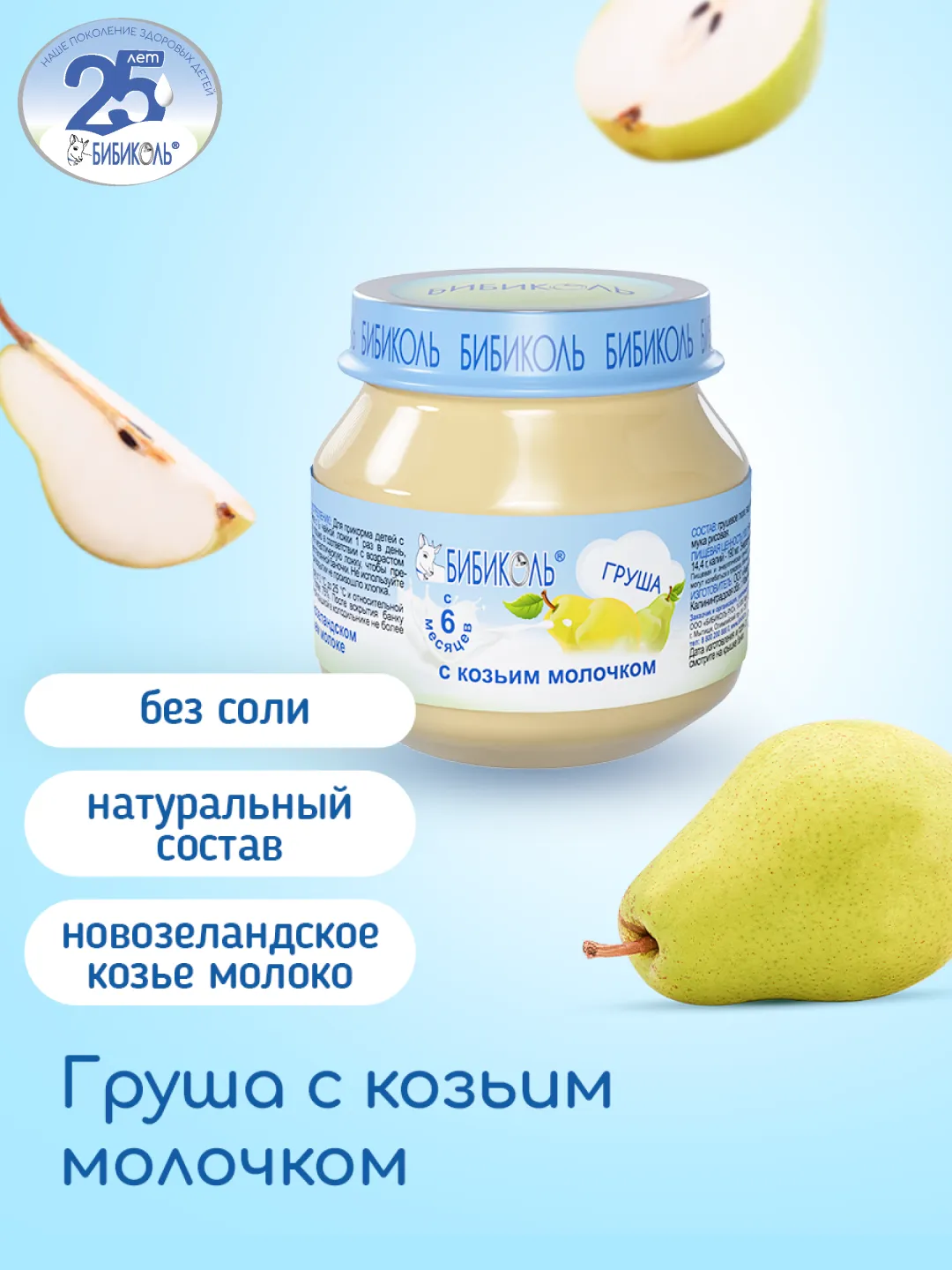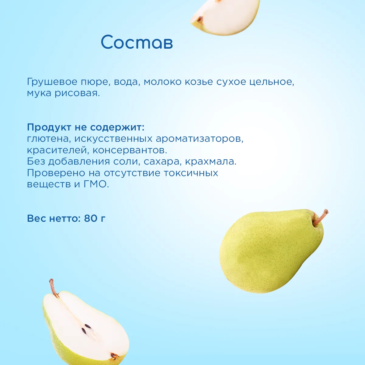 Состав: грушевое пюре, вода, молоко козье сухое цельное, мука рисовая