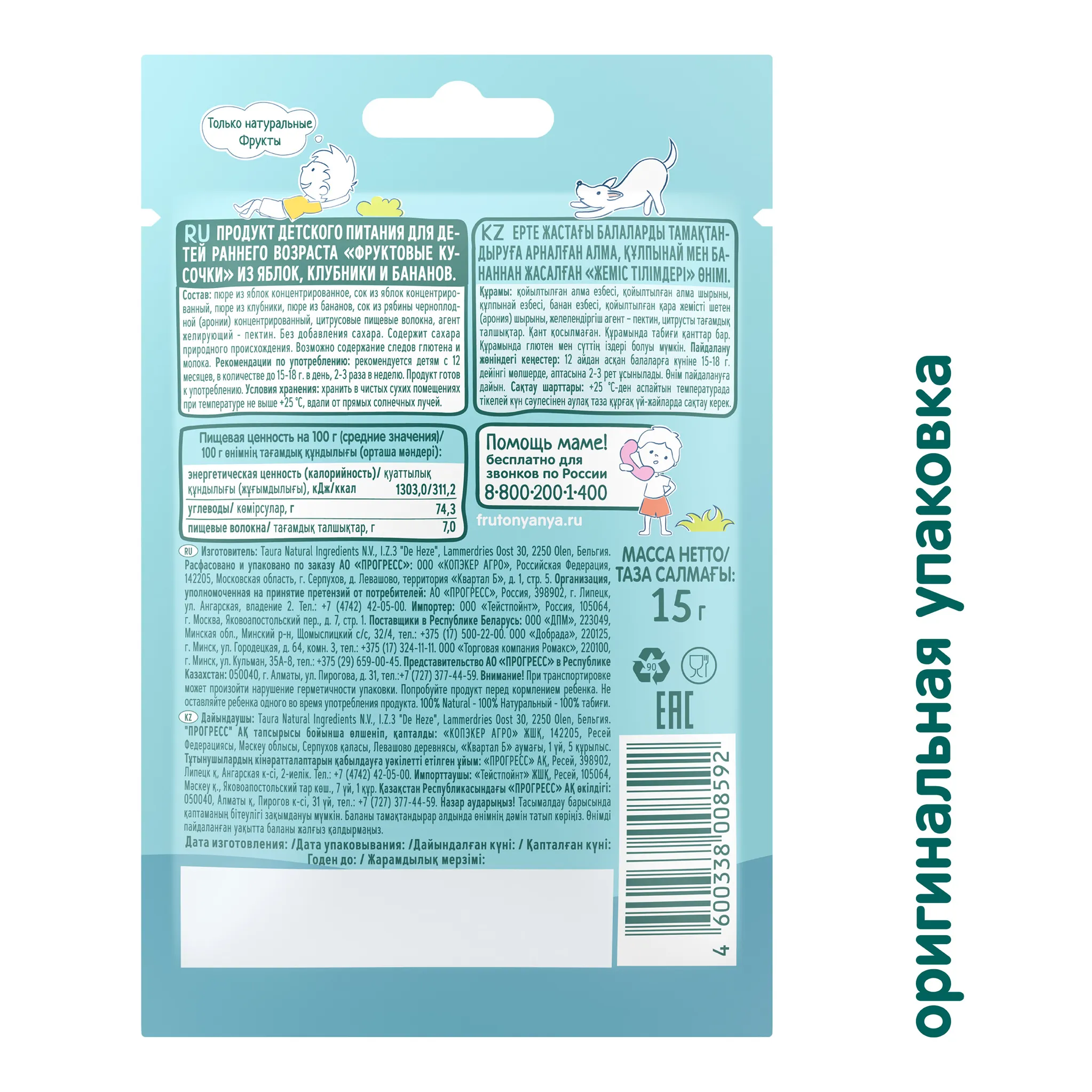 Кусочки фруктовые ФрутоНяня из яблок клубники и бананов 15г с 12месяцев