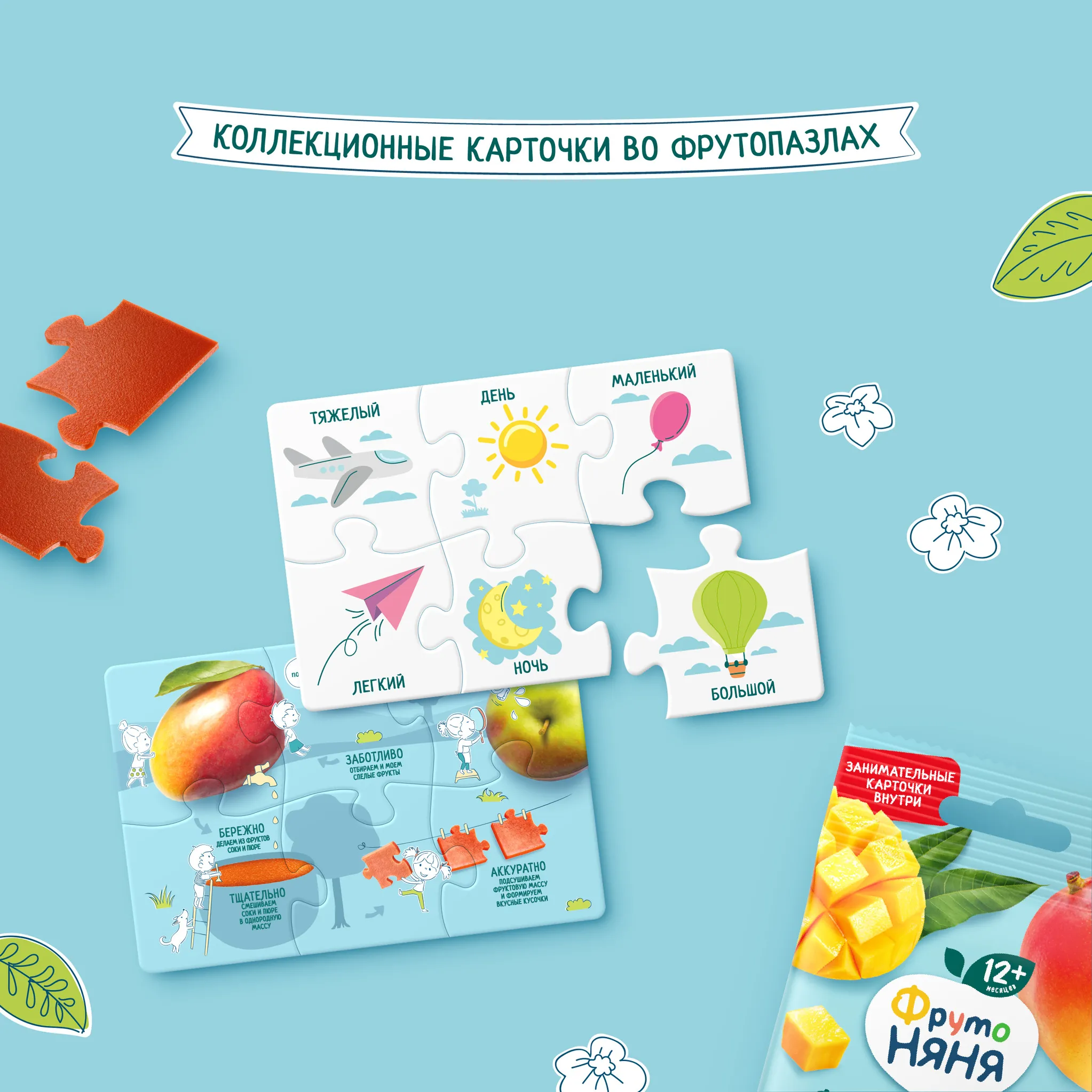 Ваш малыш уже активно познает мир? Встречайте новинку: любимое малышами натуральное лакомство в уникальной форме фруктовых пазлов! Они приготовлены только из отборных фруктов без добавления сахара. Кроме вкусных ФрутоПазлов в каждой упаковке находятся коллекционные карточки для изучения антонимов. Счастье видеть, как малыш узнает что-то новое с пользой для него!