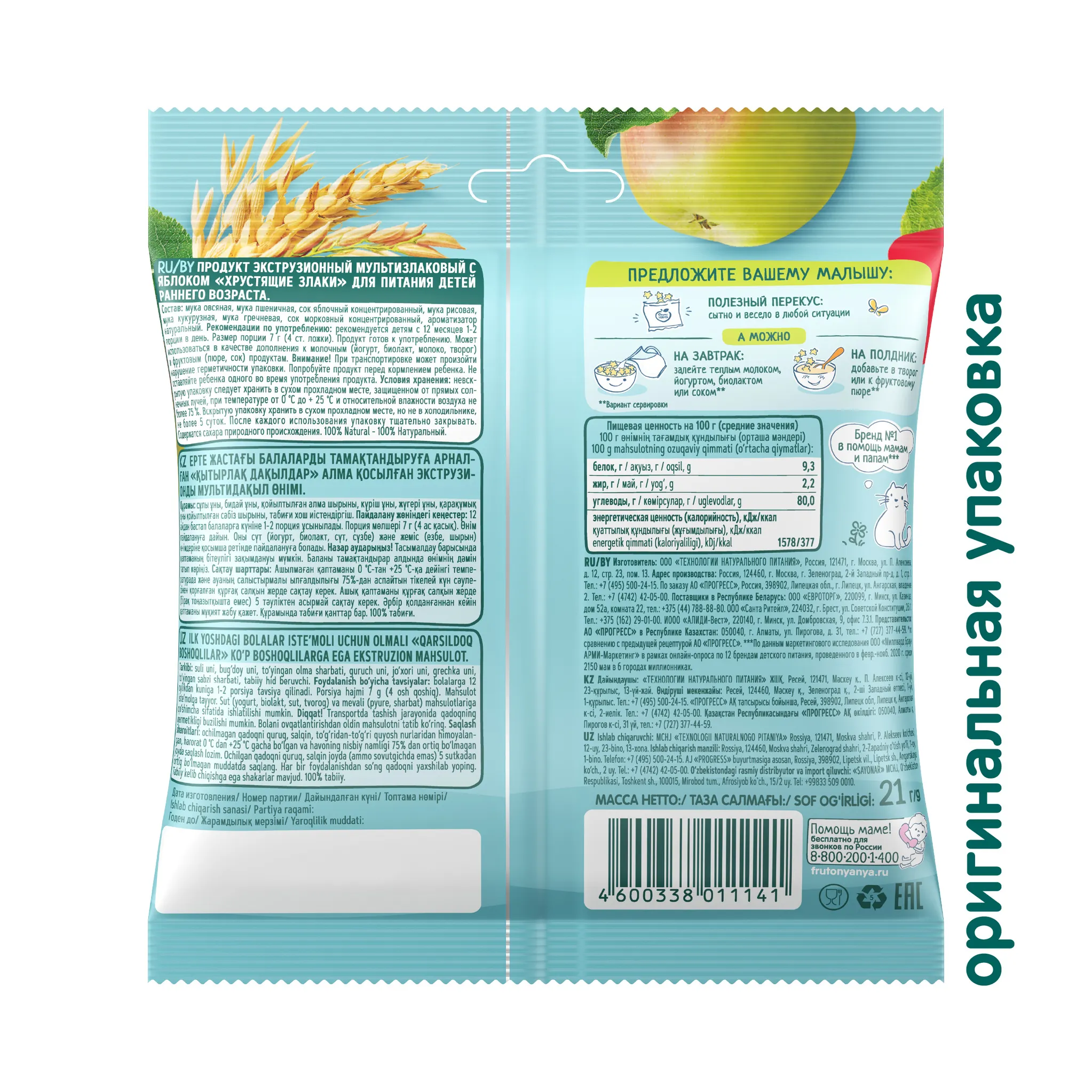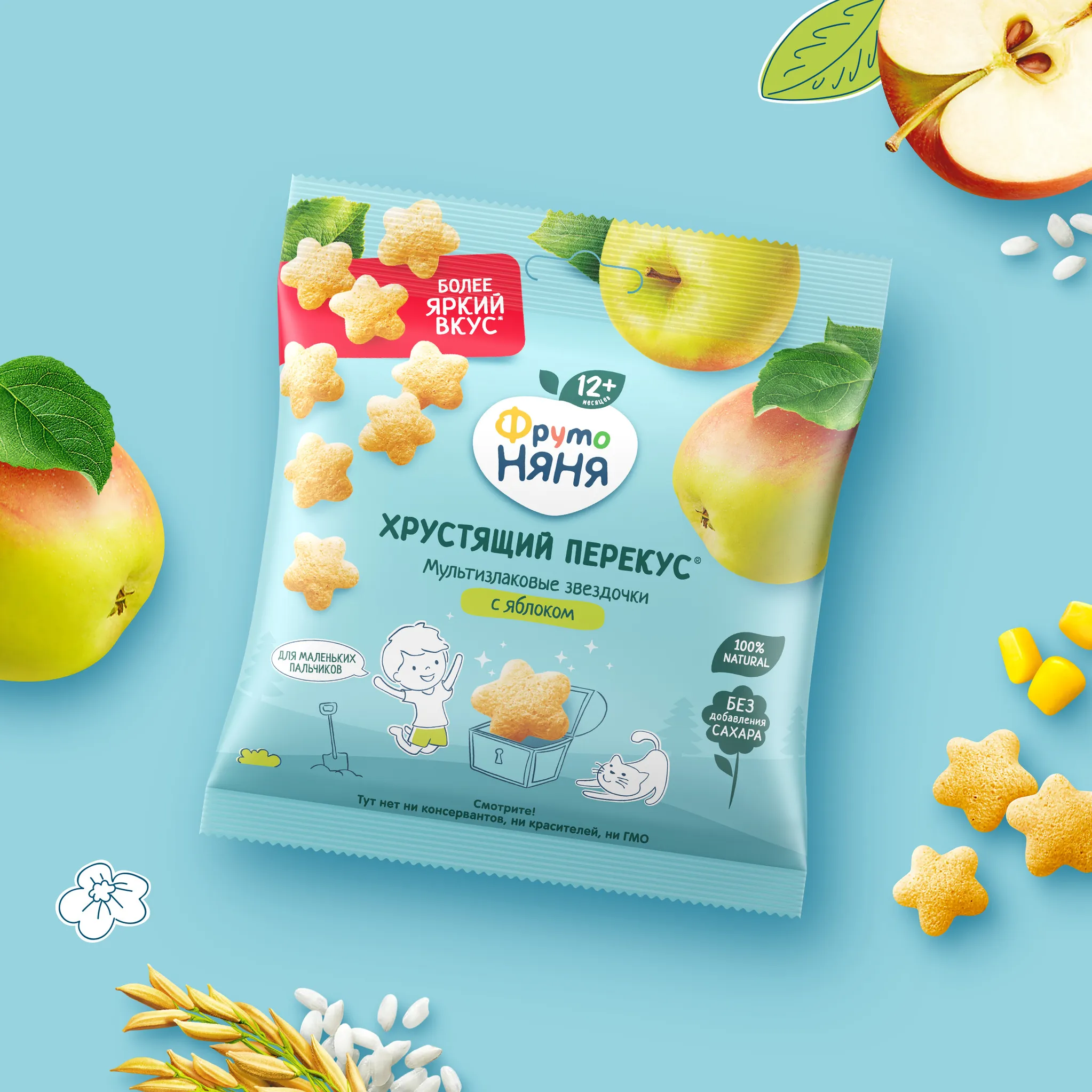 «Хрустящий перекус» с яблоком от «ФрутоНяни» в форме звездочек создан специально для малышей старше 12 месяцев. Эти мультизлаковые звездочки обеспечат ребенка энергией благодаря питательным злакам в составе. Сладость перекусу придает натуральный яблочный сок без добавления сахара. Хрустящие звездочки станут отличным выбором для легкого перекуса дома, на прогулке или в поездке, а также для полдника или более плотного приема пищи, например с молоком или йогуртом.