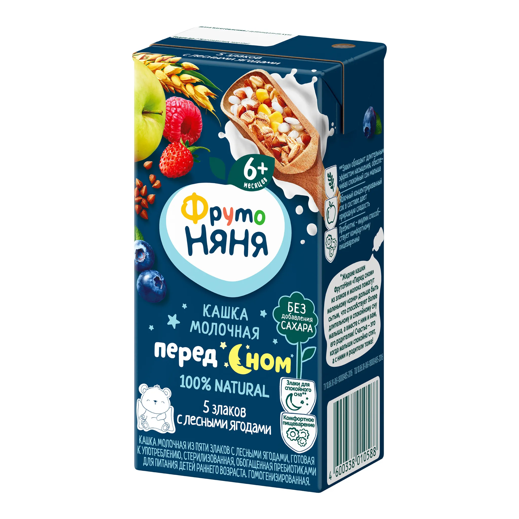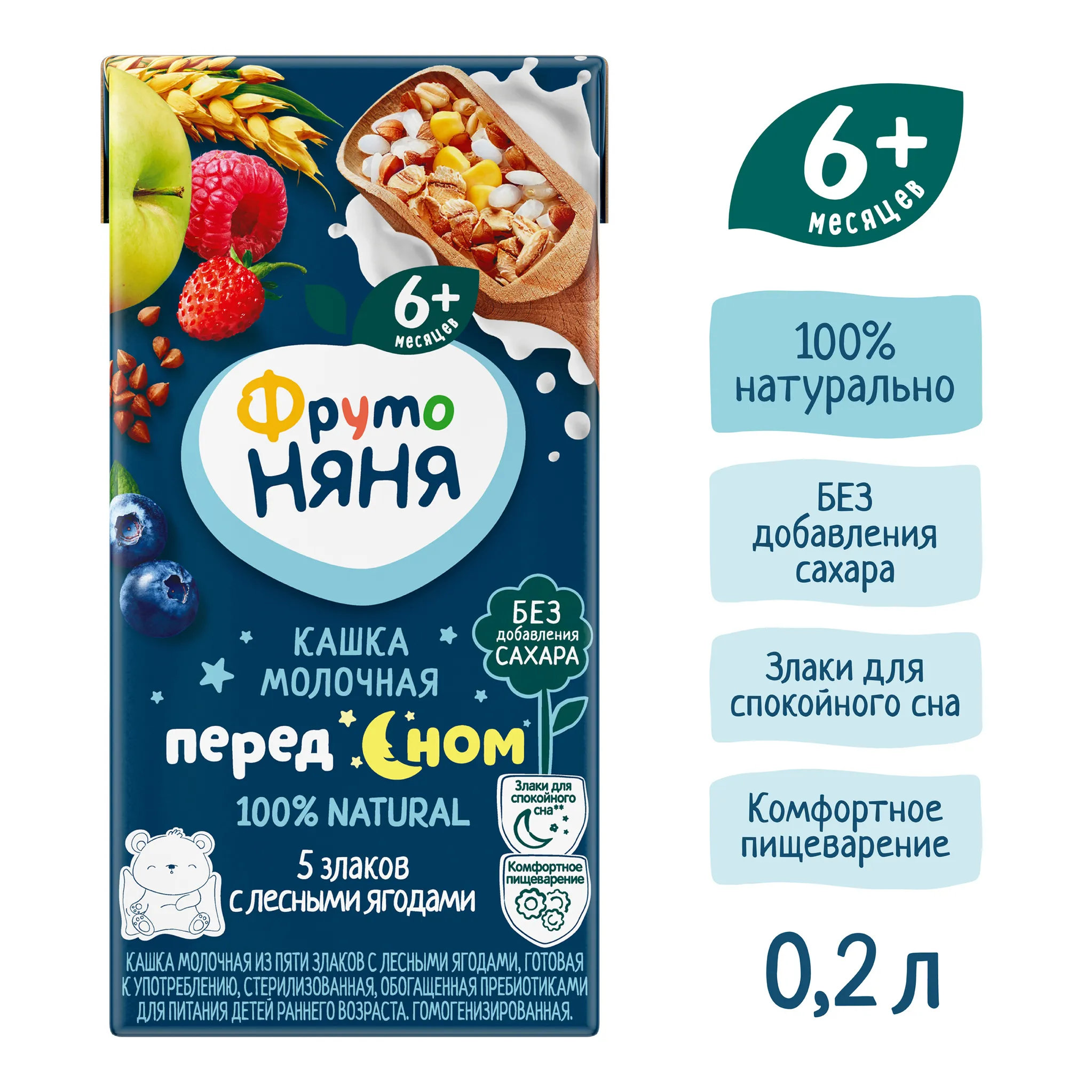 Кашка молочная из пяти злаков с лесными ягодами, готовая к употреблению, стерилизованная, обогащенная пребиотиками для питания детей раннего возраста. Гомогенизированная.