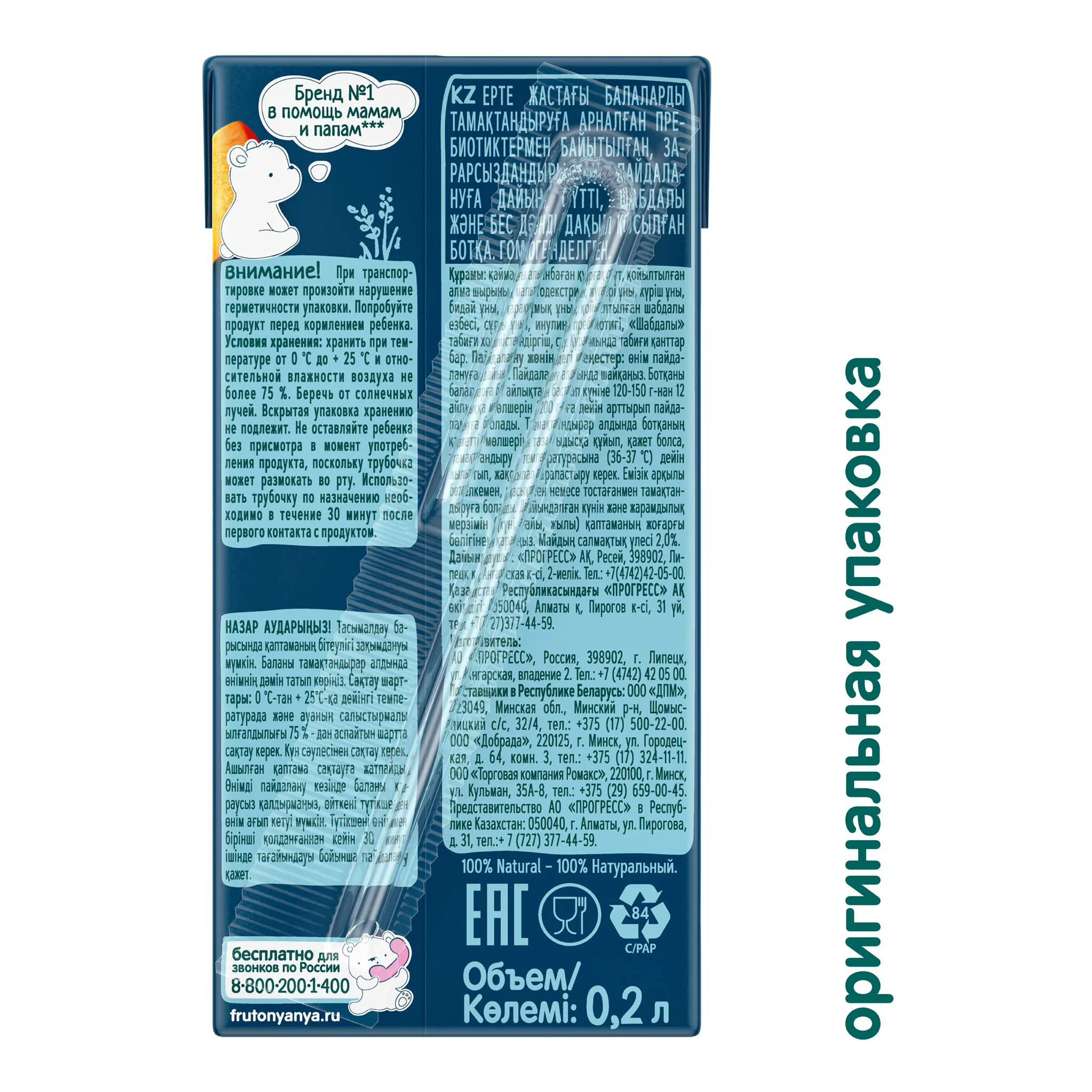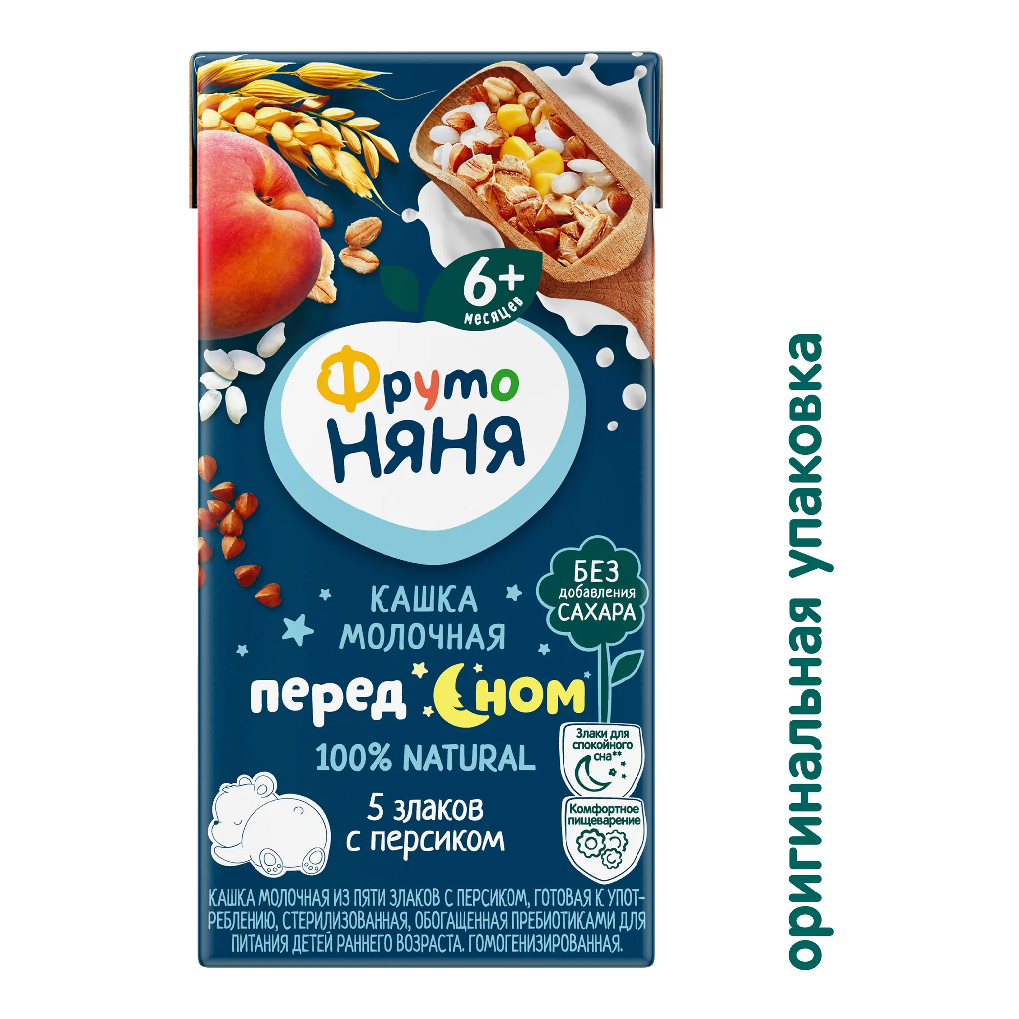 ФрутоНяня кашка молочная из пяти злаков с персиком, готовая к употреблению, стерилизованная, обогащенная пребиотиками, с фруктозой для питания детей раннего возраста. Гомогенизированная.