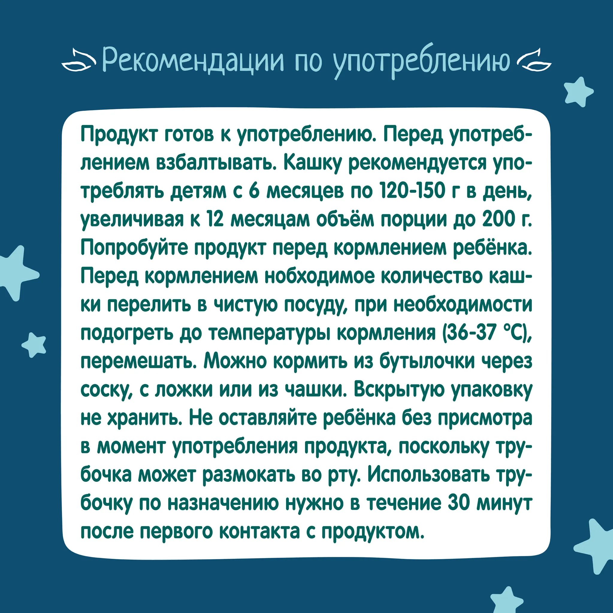 Рекомендации по употреблению: рекомендуется детям с 6 месяцев по 120-150 г в день, увеличивая к 12 месяцам объем порции до 200 г. Перед кормлением необходимое количество кашки перелить в чистую посуду и при необходимости подогреть до температуры кормления (36-37)°С, хорошо перемешать. Можно кормить из бутылочки через соску, с ложки или из чашки.