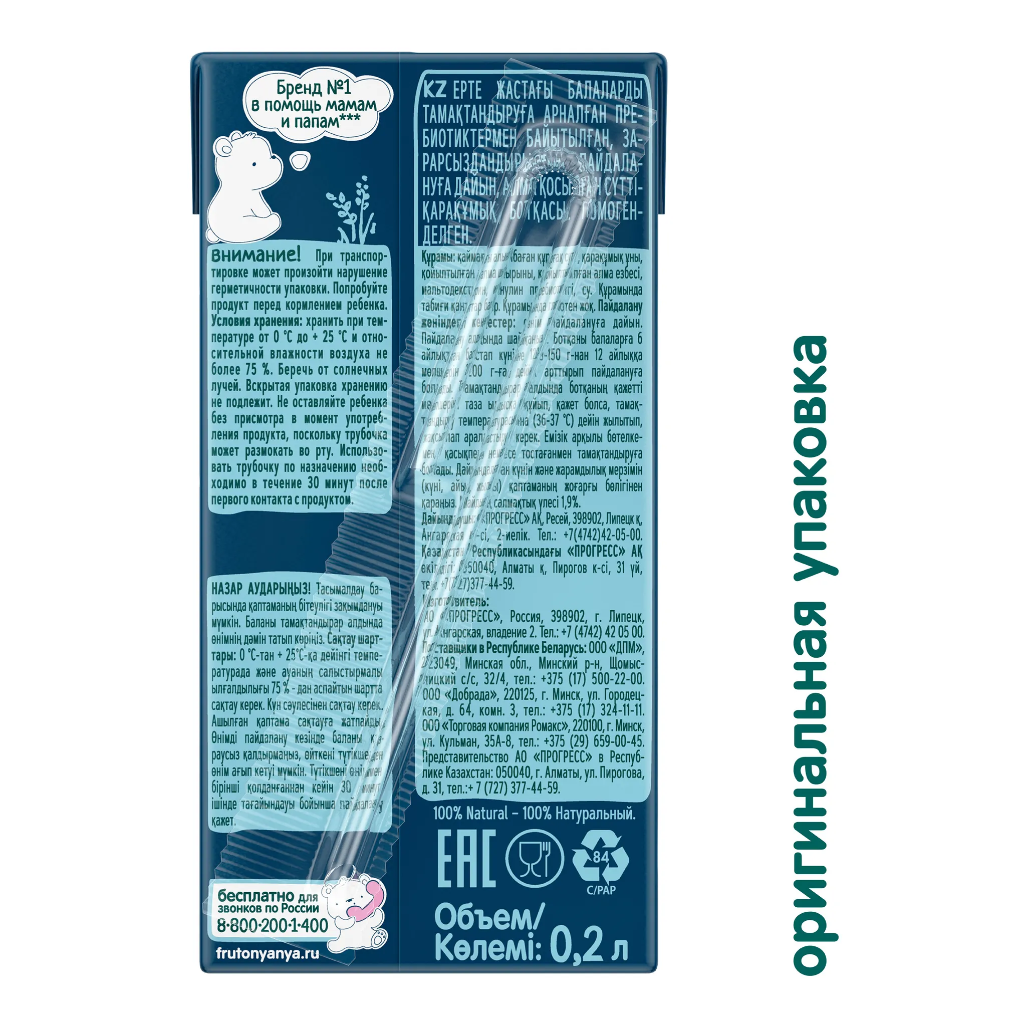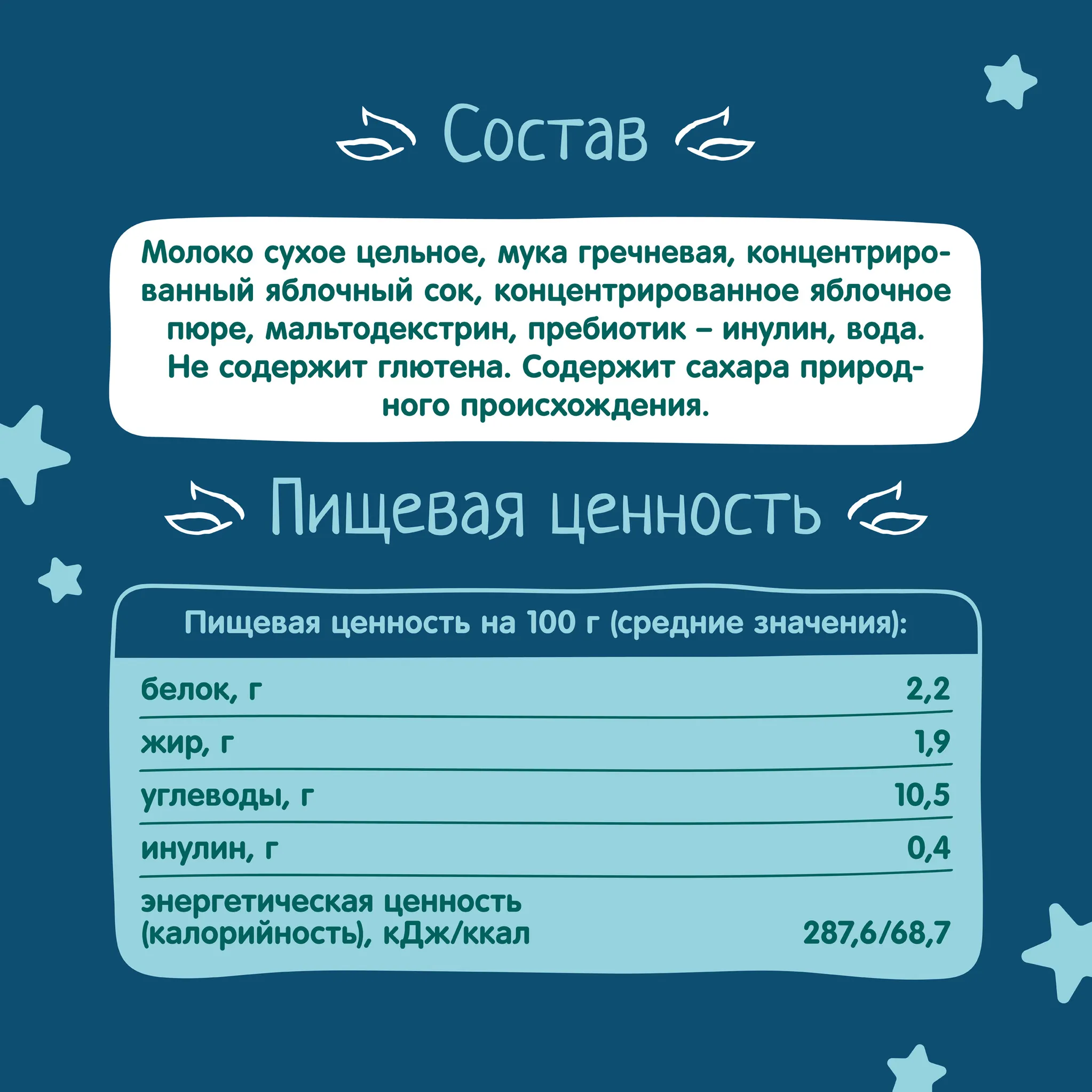 ФрутоНяня кашка молочно-гречневая с яблоками, готовая к употреблению, стерилизованная, обогащенная пребиотиками, с фруктозой для питания детей раннего возраста. Гомогенизированная.