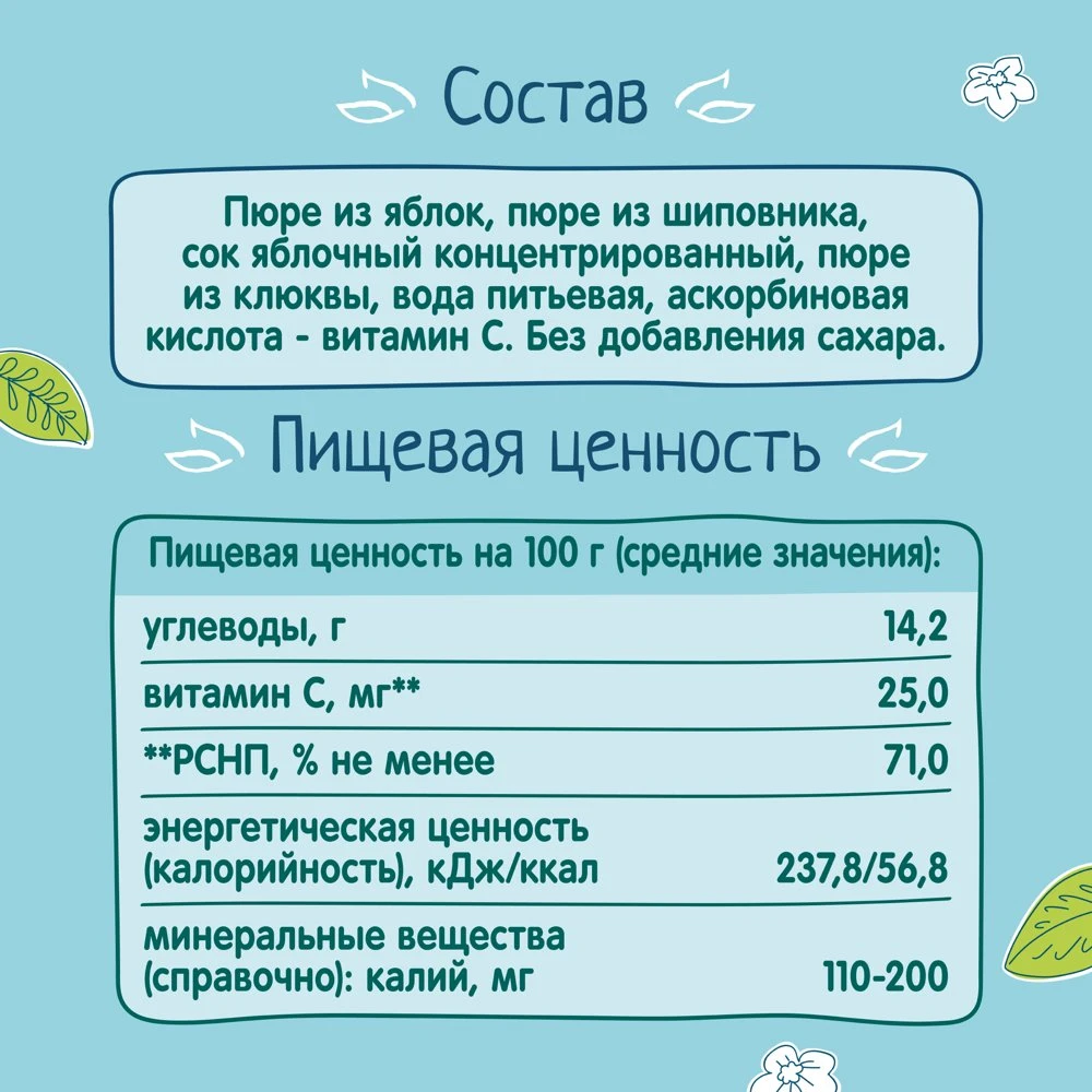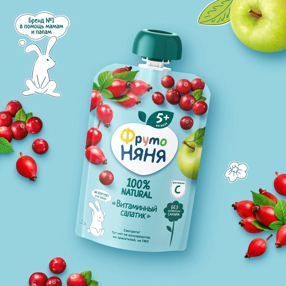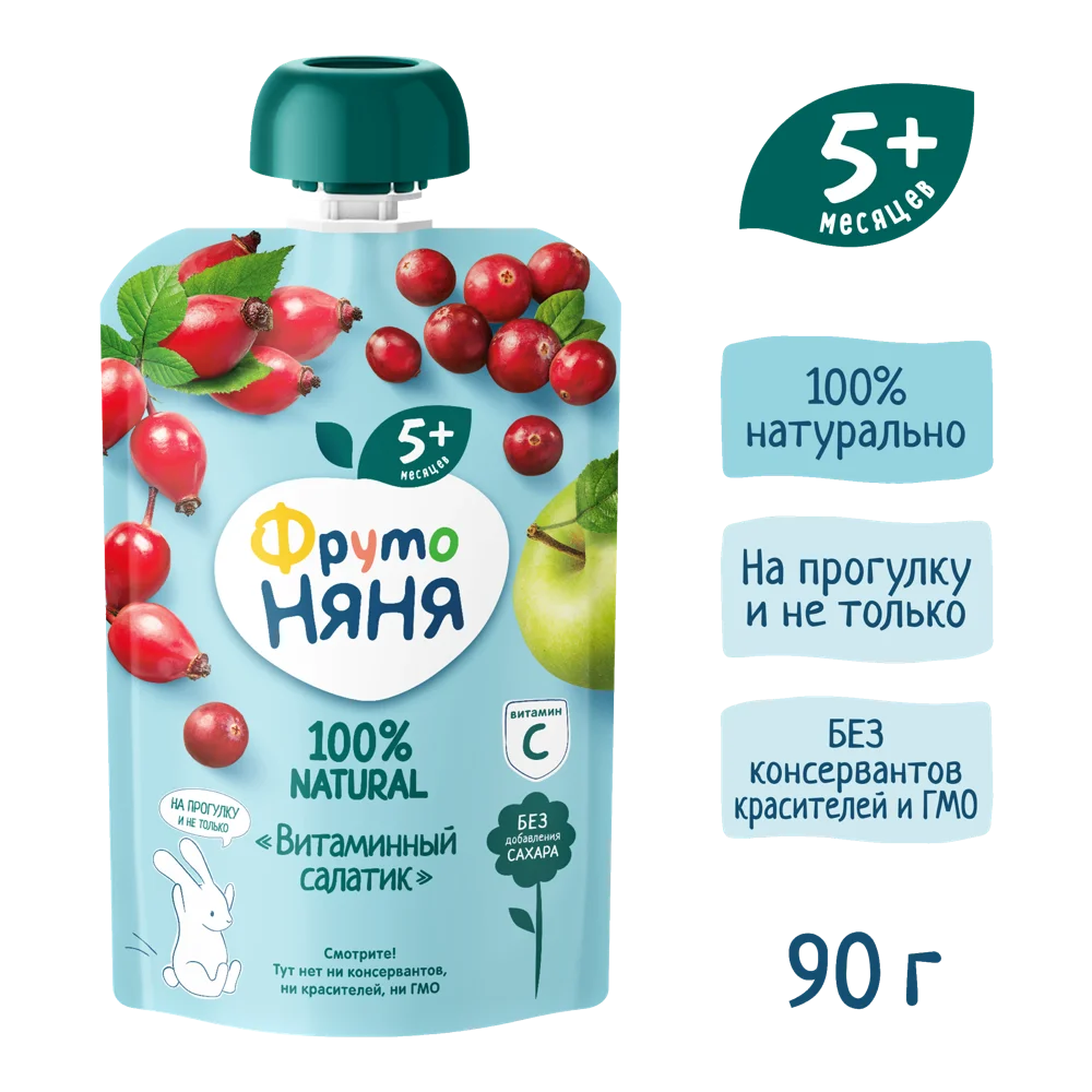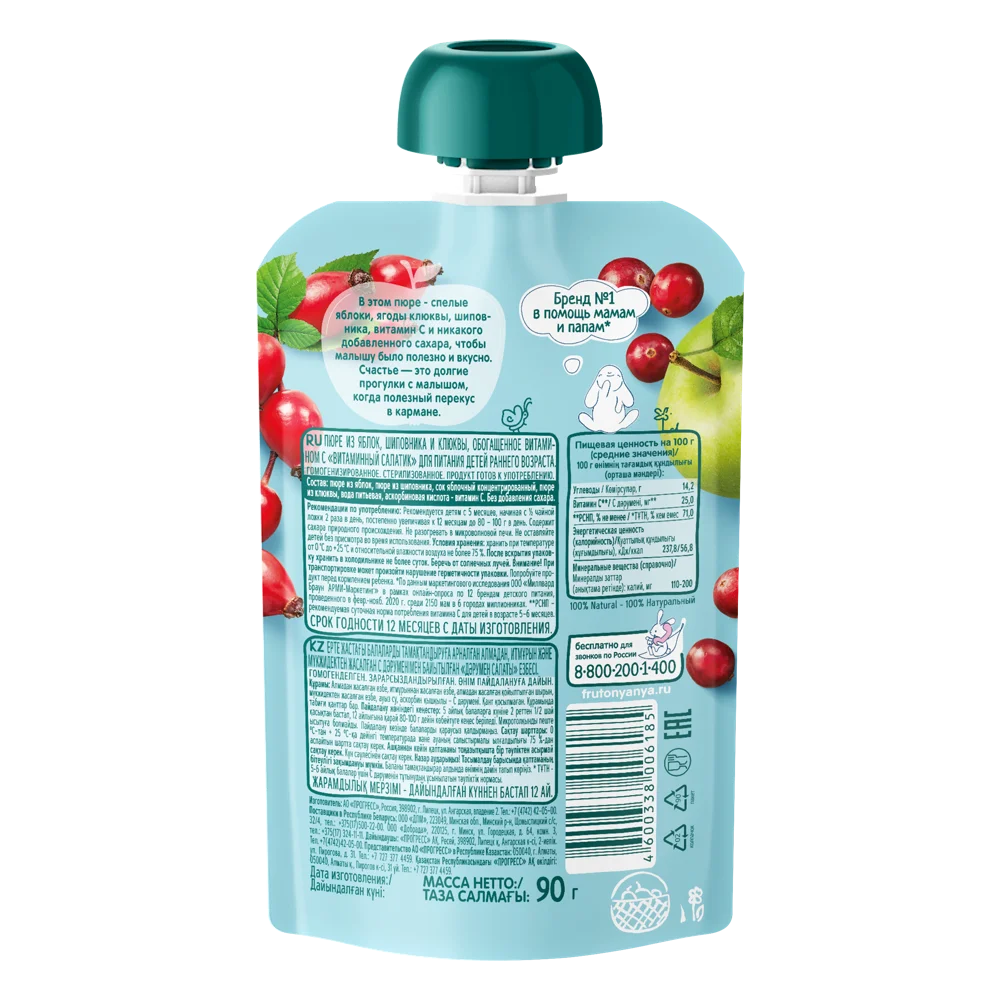 Фруктовое пюре «Витаминный салатик» от «ФрутоНяни» в мягкой упаковке — это вкусный и полезный перекус, который удобно брать с собой, а яркая мягкая упаковка привлечет внимание вашего малыша и позволит ему есть самостоятельно. Спелые яблоки, ягоды клюквы, шиповника и витамин С обеспечат организм вашего малыша природной пользой и энергией для гармоничного роста!