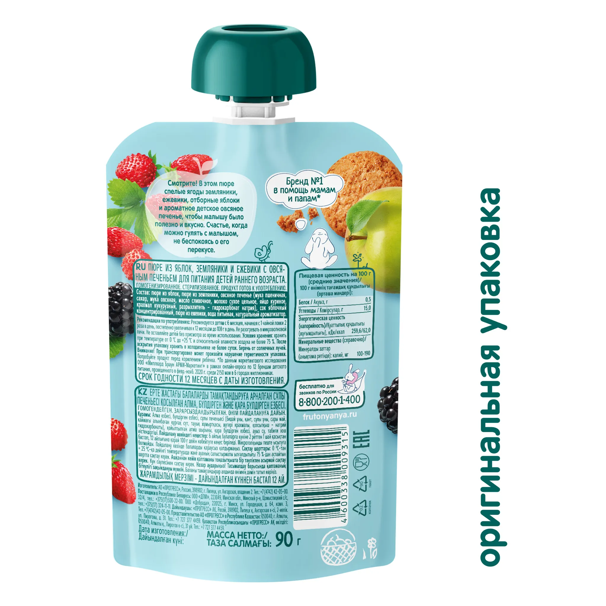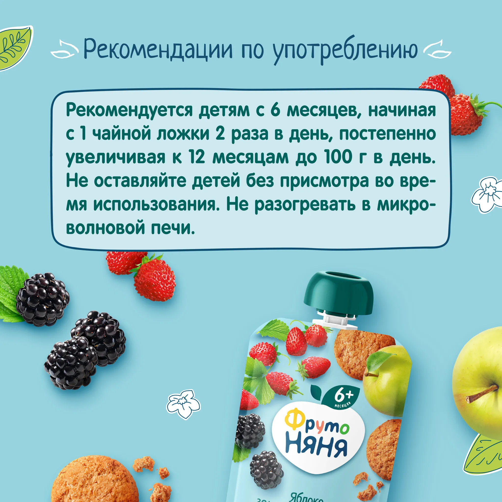 Фруктовое пюре ФрутоНяня из яблок, ежевики и земляники с овсяным печеньем в мягкой упаковке — это вкусный и полезный перекус, который удобно брать с собой, а яркая мягкая упаковка привлечет внимание вашего малыша и позволит ему есть самостоятельно. Спелые ягоды, а также яблоки и специальное детское печенье обеспечат организм вашего малыша природной пользой и энергией для гармоничного роста!