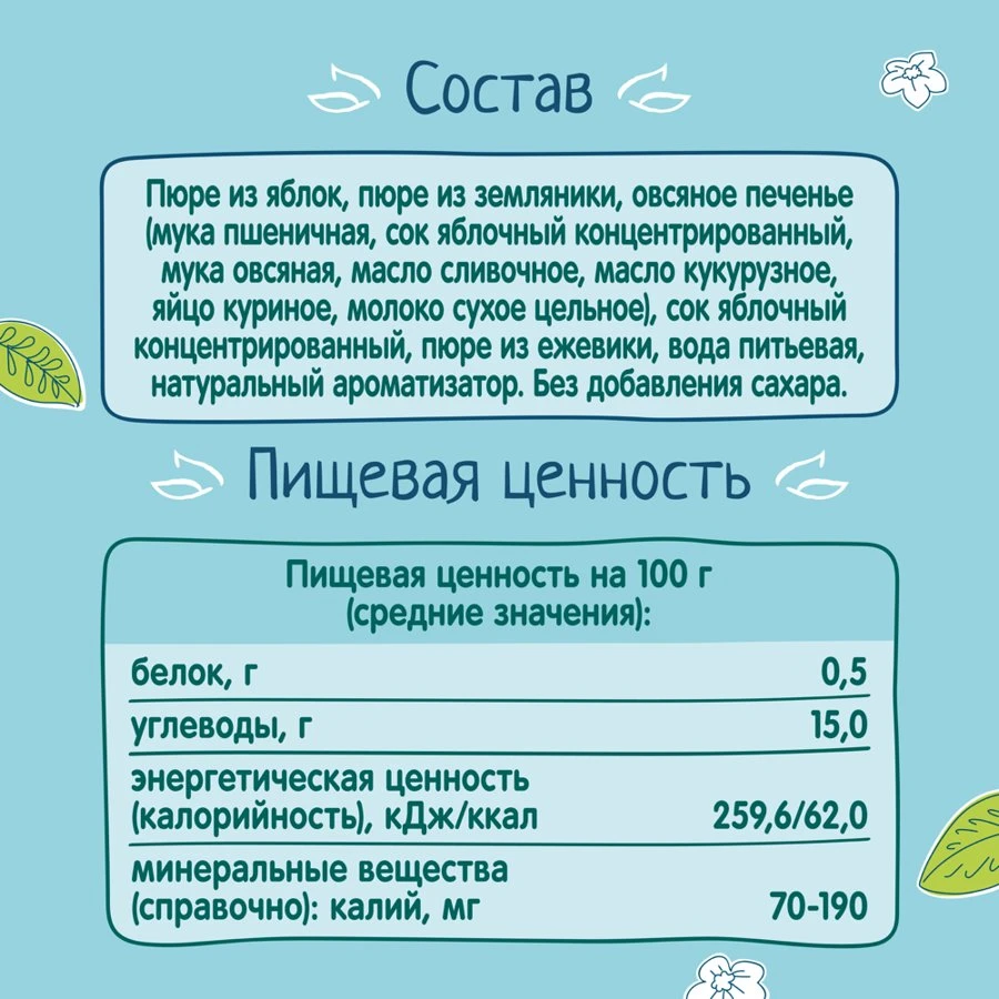 Пюре из яблок, пюре из земляники, овсяное печенье (мука пшеничная, сахар, мука овсяная, масло сливочное, молоко сухое цельное, яйцо куриное, крахмал кукурузные, разрыхлитель – гидрокарбонат натрия), сок яблочный концентрированный, пюре из ежевики, вода питьевая, натуральный ароматизатор
