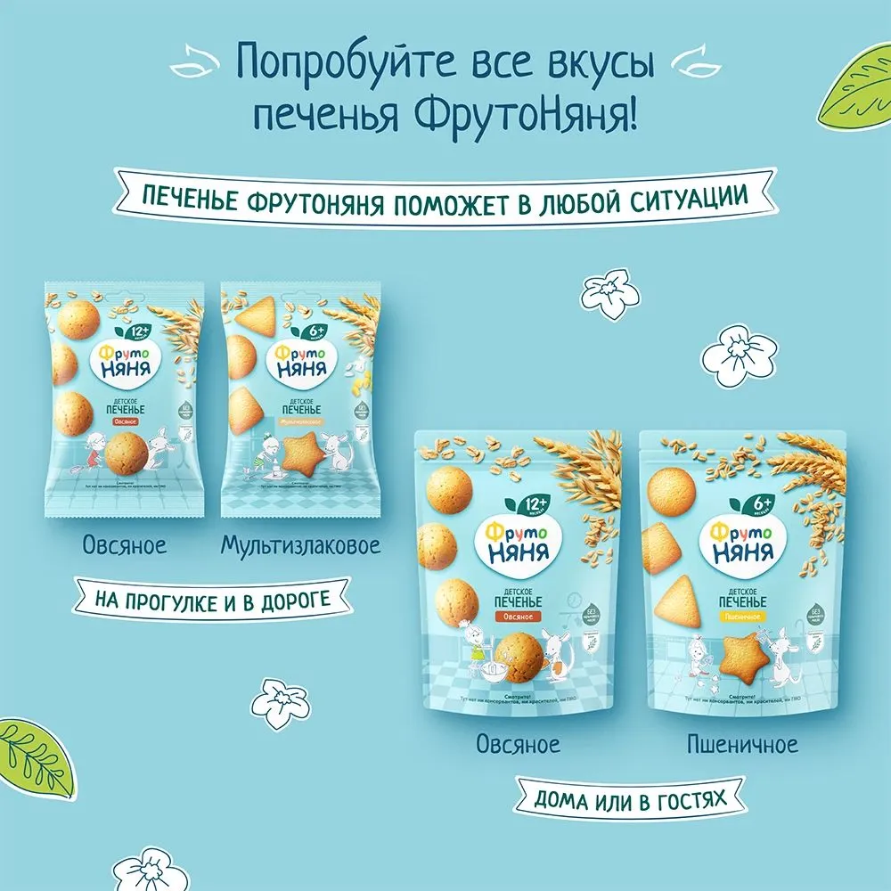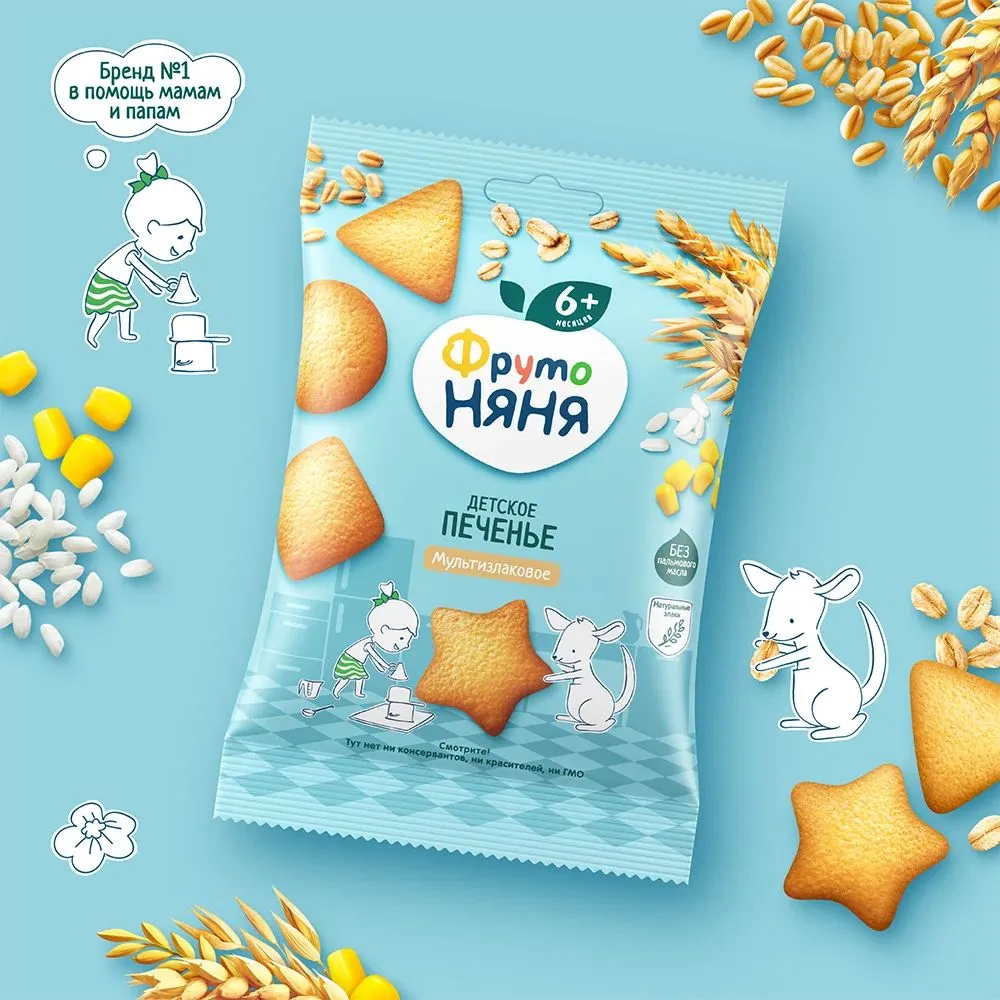 Печенье с героями «ФрутоНяня» в форме четырех фигур. Форма печенья и герои повторяются на упаковке в виде специальных отверстий, что позволяет в игровой форме изучать животных и геометрические фигуры.