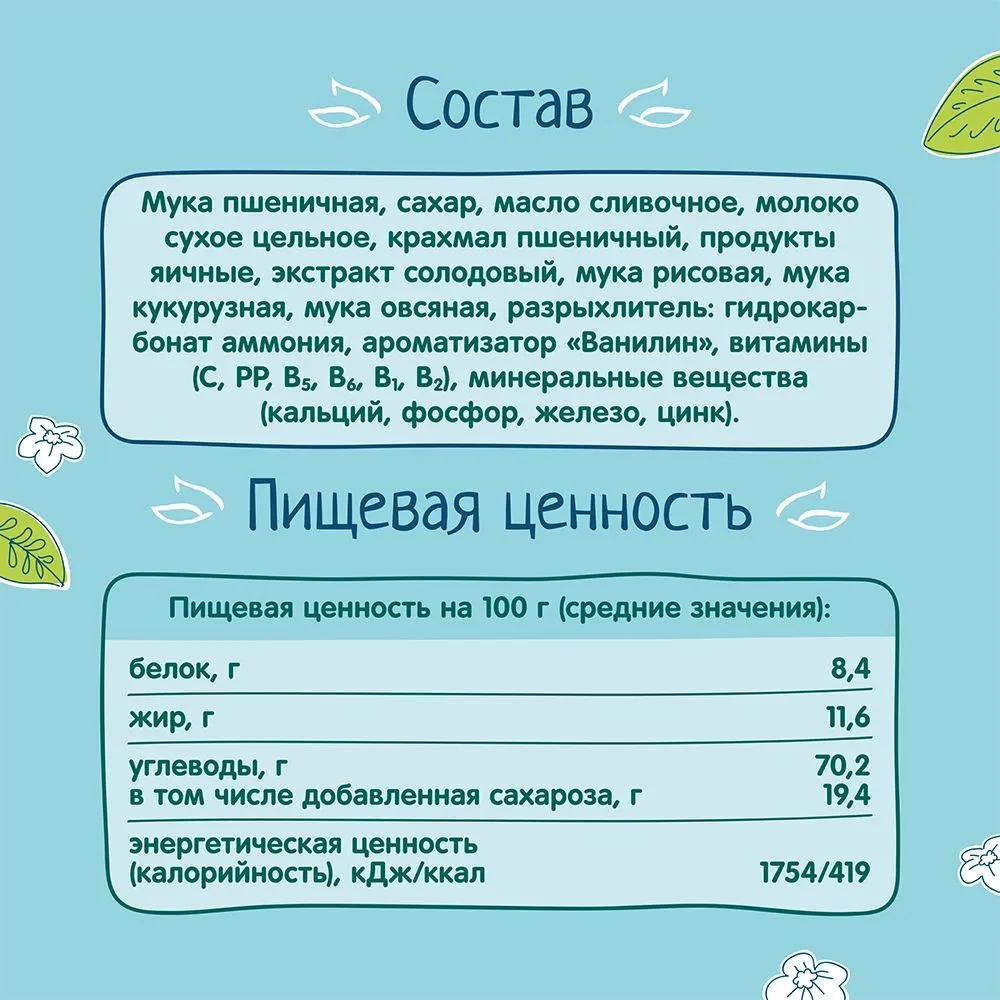Мука пшеничная, сахар, масло сливочное, молоко сухое цельное, крахмал пшеничный, продукты яичные, экстракт солодовый, мука рисовая, мука кукурузная, мука овсяная, разрыхлитель: гидрокарбонат аммония, ароматизатор «Ванилин», витамины (С, РР, В5, В6, В1, В2), минеральные вещества (кальций, фосфор, железо, цинк)