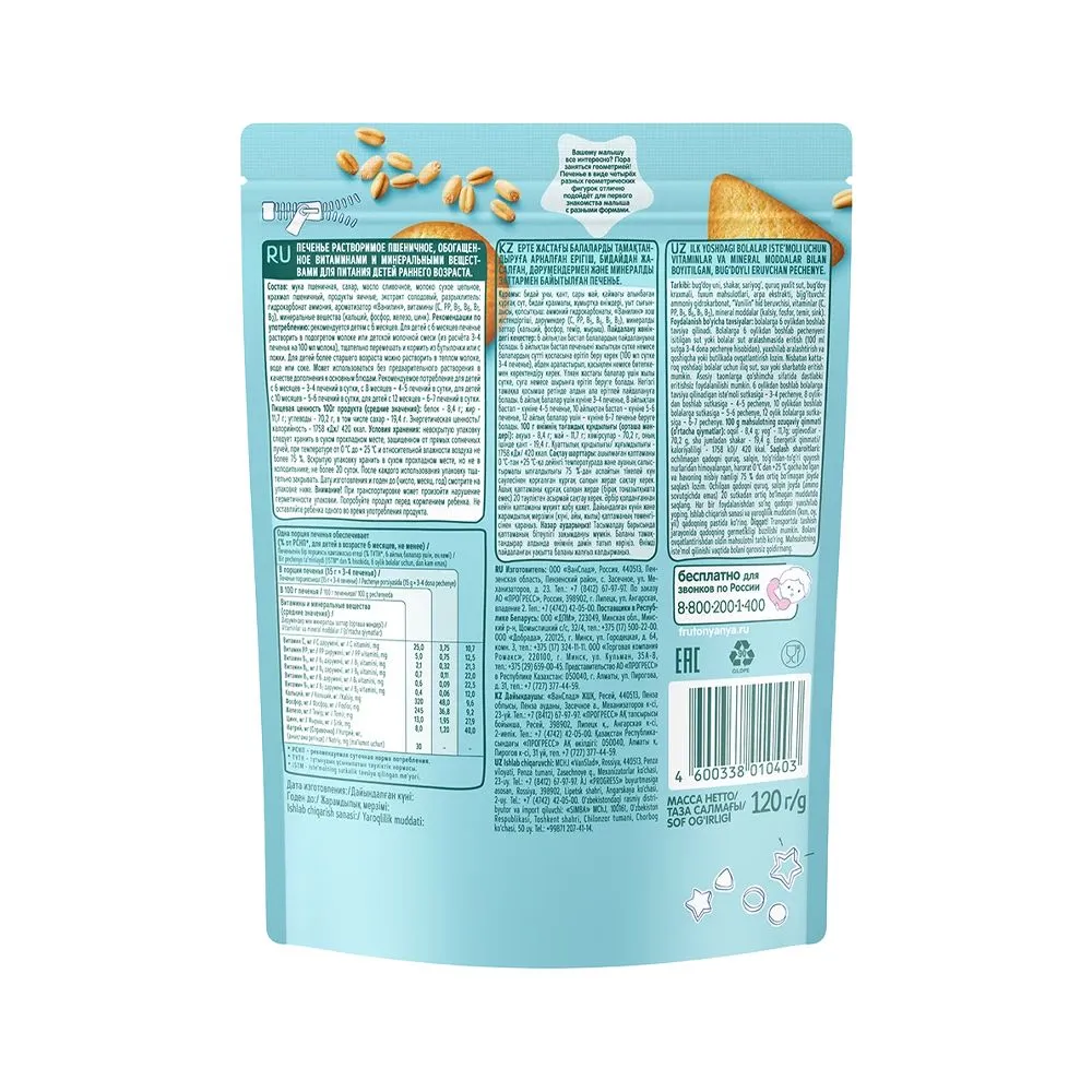 "ФрутоНяня" Печенье 120г растворимое пшеничное, обогащенное витаминами и минеральными веществами для питания детей раннего возраста.