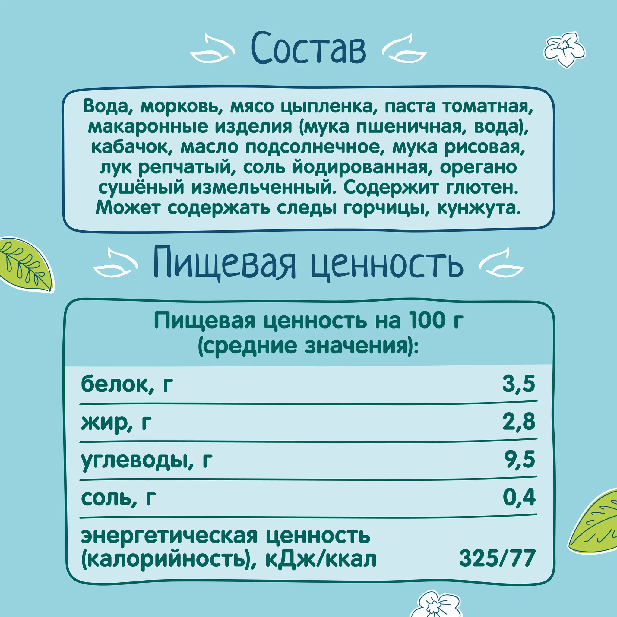 вода, морковь, мясо цыпленка, паста томатная, макаронные изделия (мука пшеничная, вода), кабачок, масло подсолнечное, мука рисовая, лук репчатый, соль йодированная, орегано сушеный измельченный