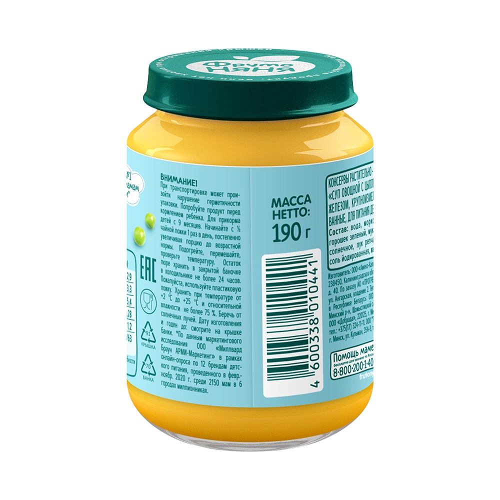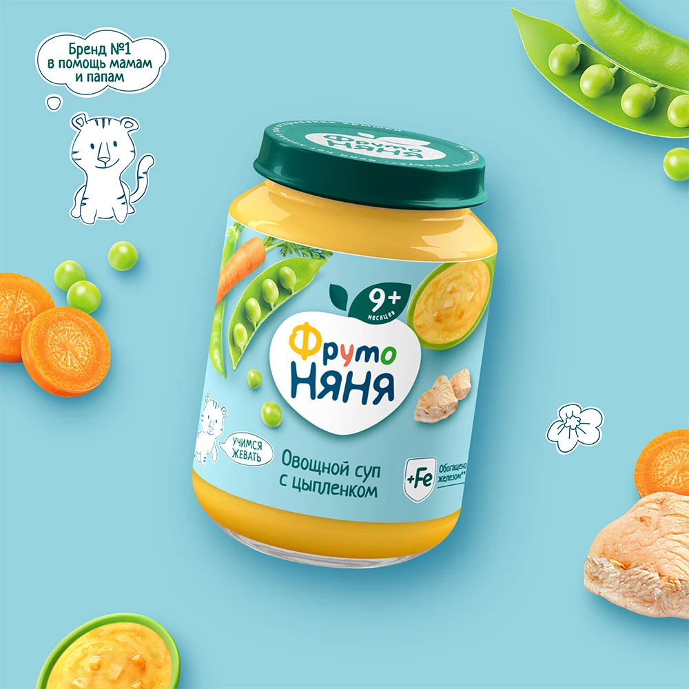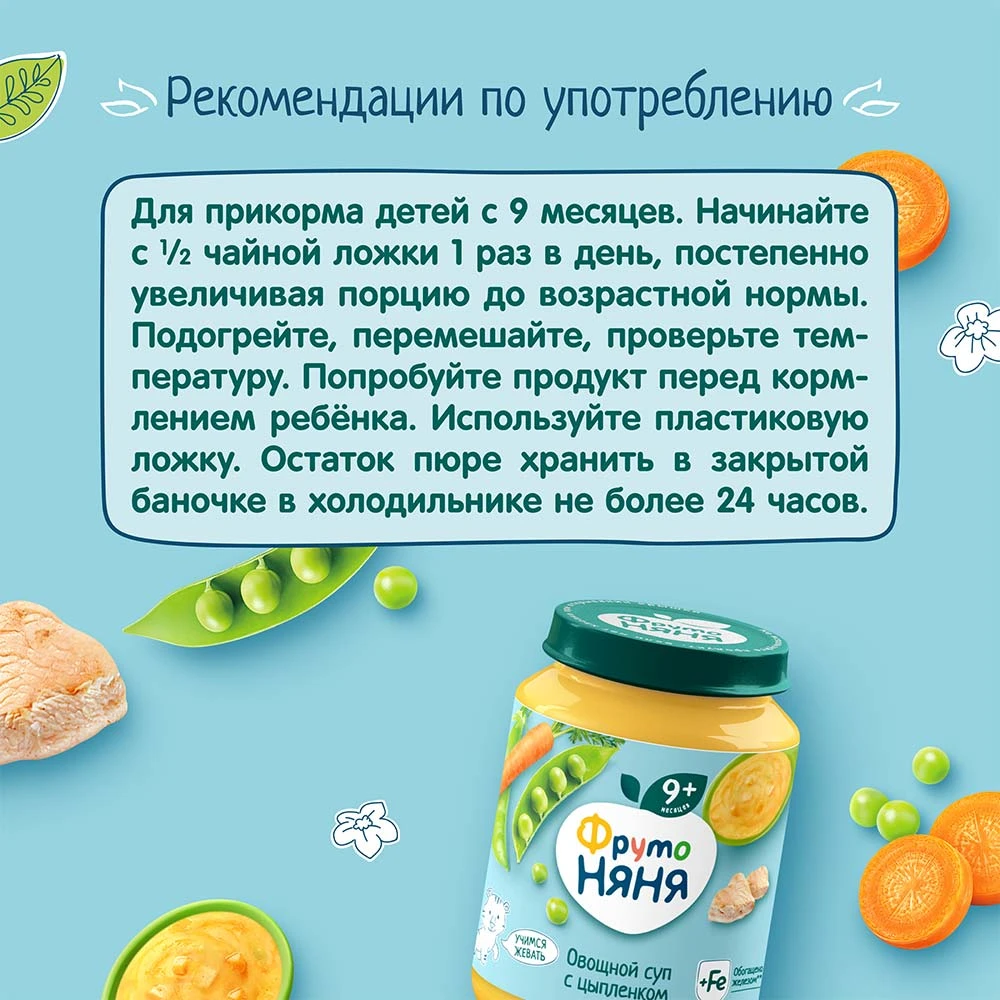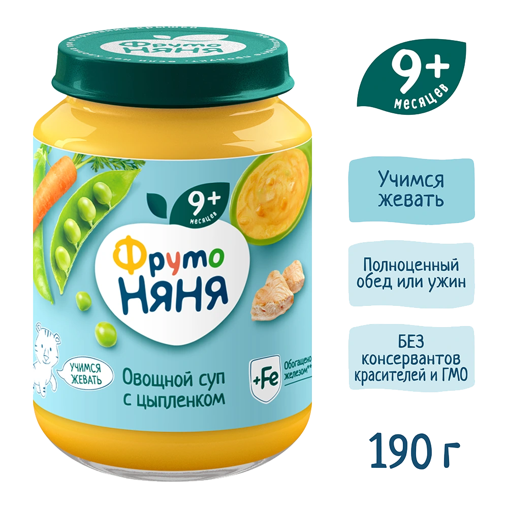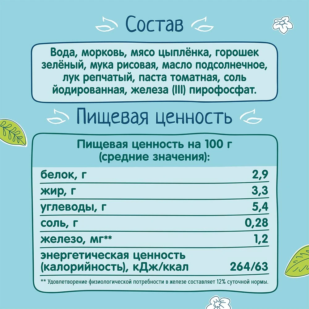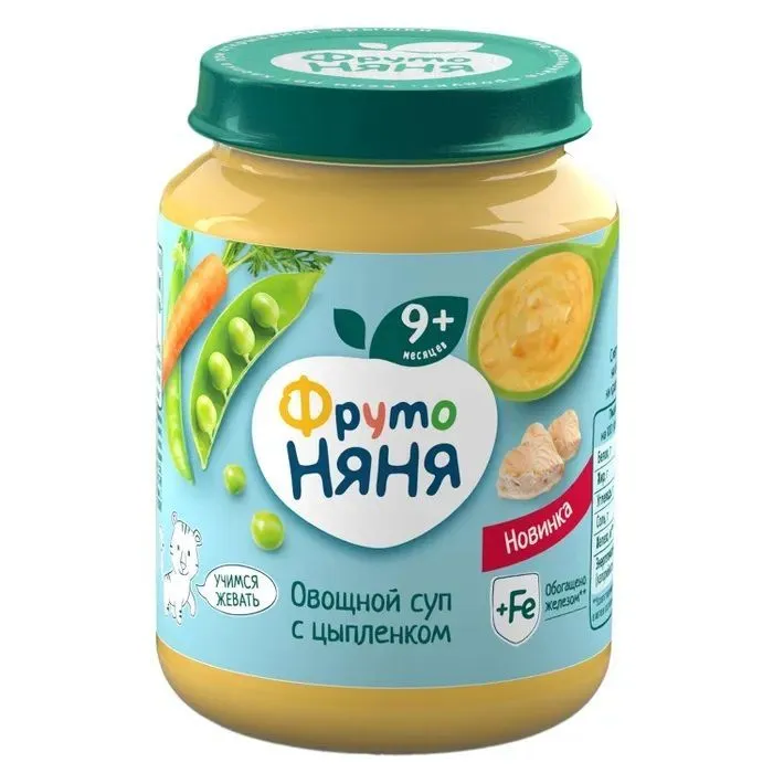 В этом возрасте малыши уже учатся жевать, и небольшие кусочки овощей и мяса дополнительно помогут развить жевательный навык. В состав вошли только натуральные компоненты: мясо цыпленка и свежие овощи — морковь, горошек зеленый, лук репчатый. Дополнительно продукт обогащен железом для нормального роста и развития ребенка.