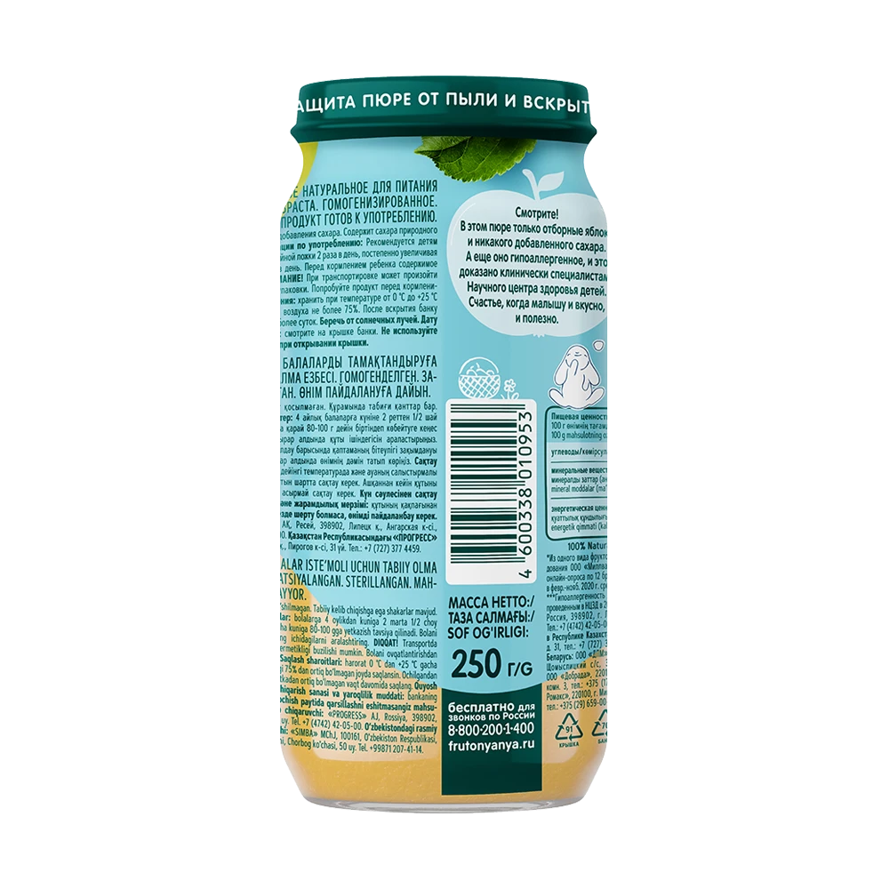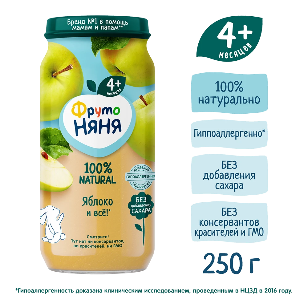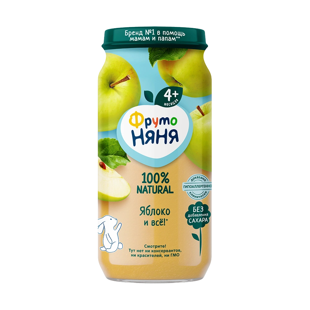 Пюре из яблок «ФрутоНяня» — это 100% натуральный продукт из спелых сочных фруктов, выращенных с любовью и заботой о вашем малыше, чтобы он получил максимум пользы и удовольствия. Подходит для первого прикорма детей с 4 месяцев. Яблочное пюре «ФрутоНяня» гипоаллергенно, и это доказано клинически. Упаковки объемом 250 г хватит на несколько порций. Открытую банку необходимо хранить в холодильнике.