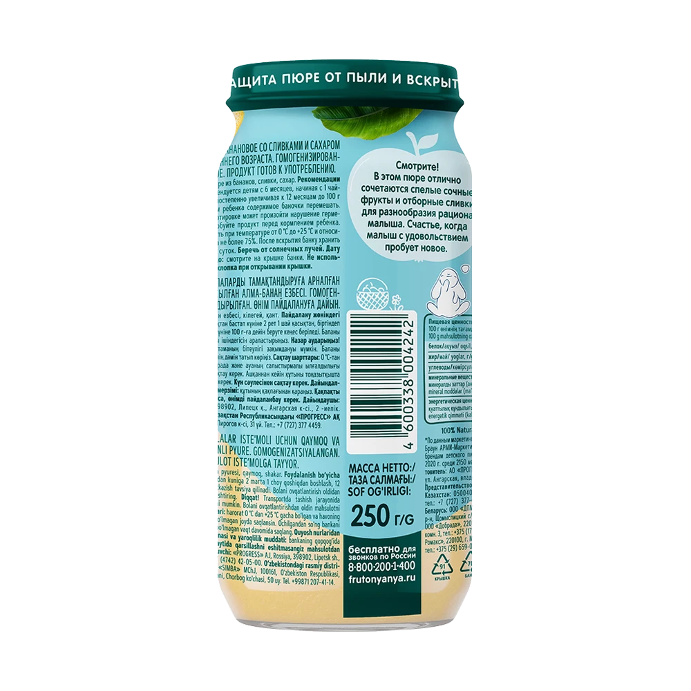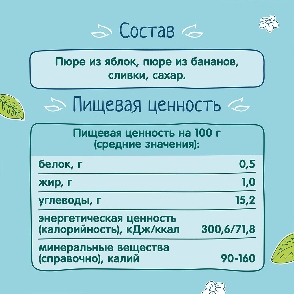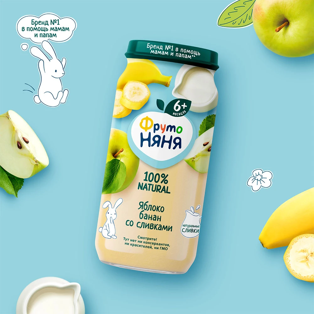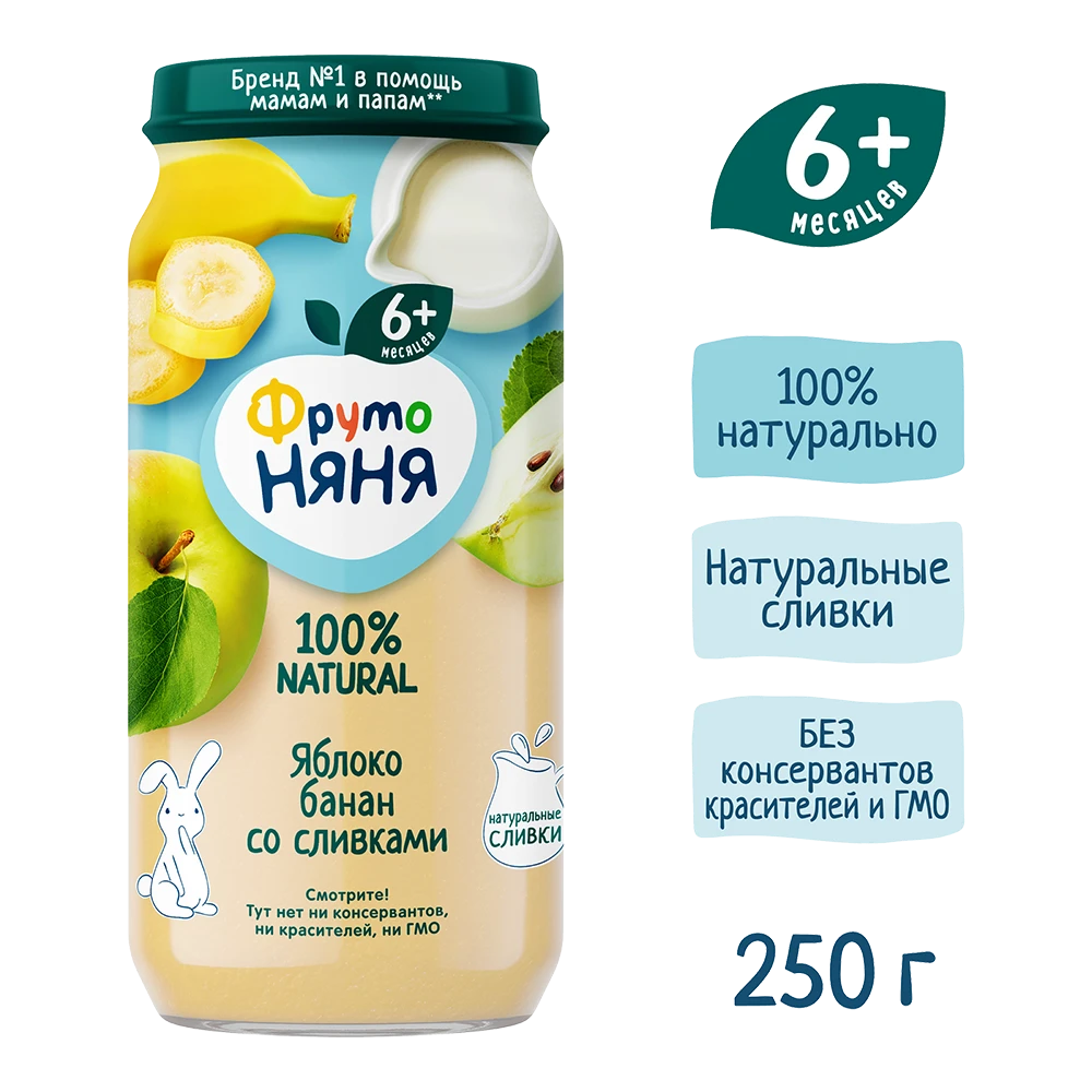 Пюре «ФрутоНяня» из яблок и бананов — это вкусный и сытный продукт, предназначенный для прикорма детей с 6 месяцев. В составе 100% натуральные ингредиенты из отборных фруктов, чтобы ваш малыш рос здоровым и активным. Вкусное и питательное пюре «ФрутоНяня» из яблок и бананов — отличный способ разнообразить рацион питания малыша. Упаковки объемом 250 мл хватит на несколько приемов. Открытую банку необходимо хранить в холодильнике.