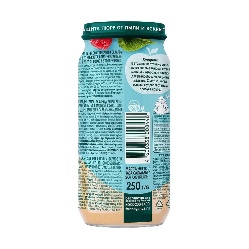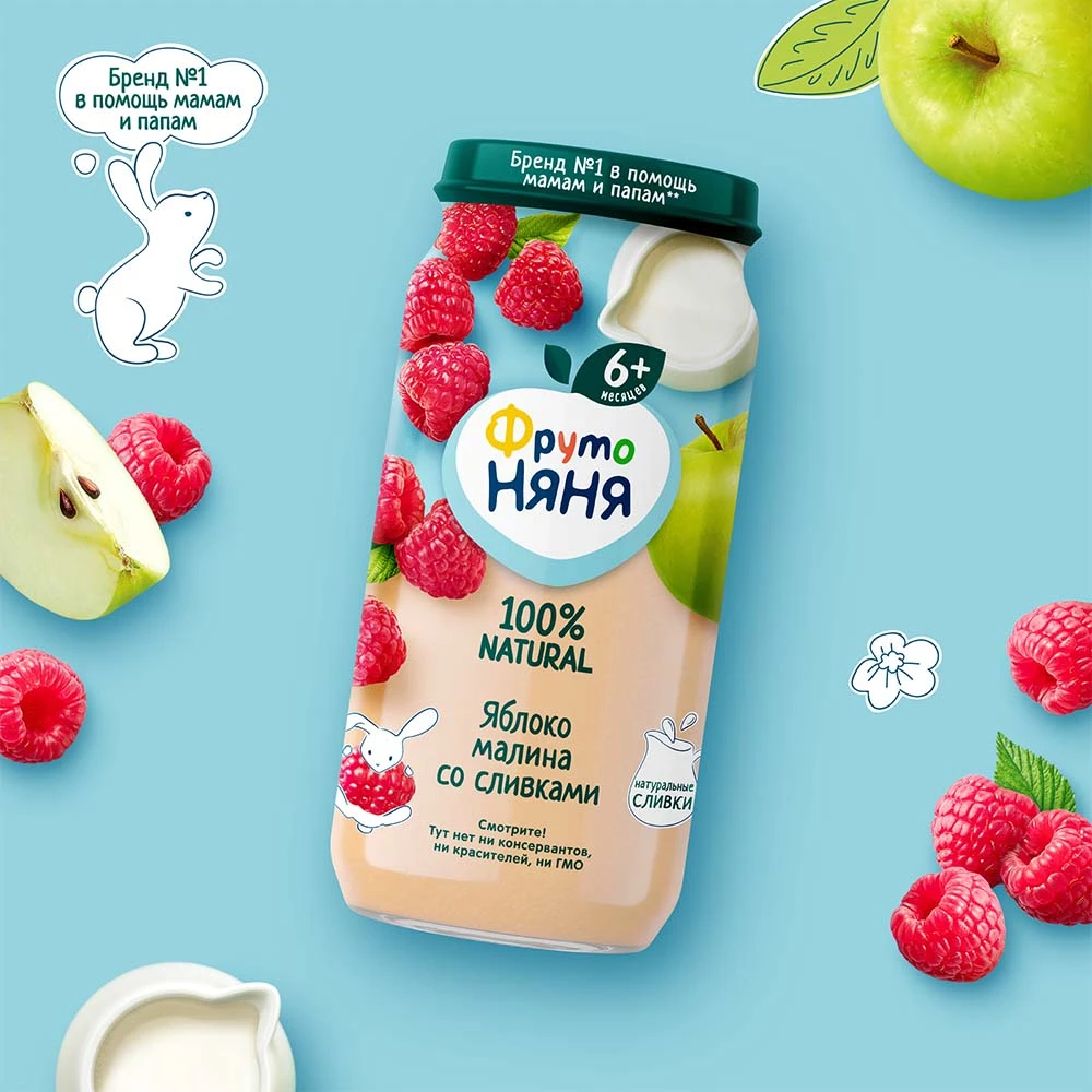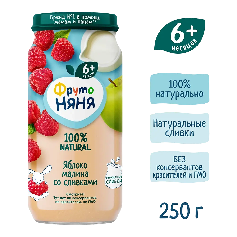 Пюре «ФрутоНяня» из яблок и малины со сливками — это невероятное сочетание сочных ягод малины, спелого яблока и отборных сливок. Познакомьте малыша с нежным и ярким вкусом ягодно-сливочного пюре, которое порадует его новыми впечатлениями и разнообразит его рацион. Продукт подходит для питания детей с 6 месяцев. Пюре из малины со сливками от «ФрутоНяни» — прекрасный способ зарядить малыша энергией и отличным настроением для новых открытий. Упаковки объемом 250 мл хватит на несколько приемов. Открытую банку необходимо хранить в холодильнике.