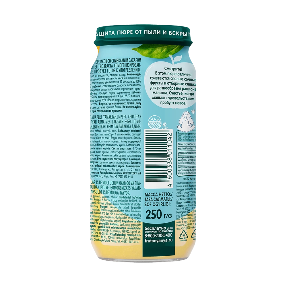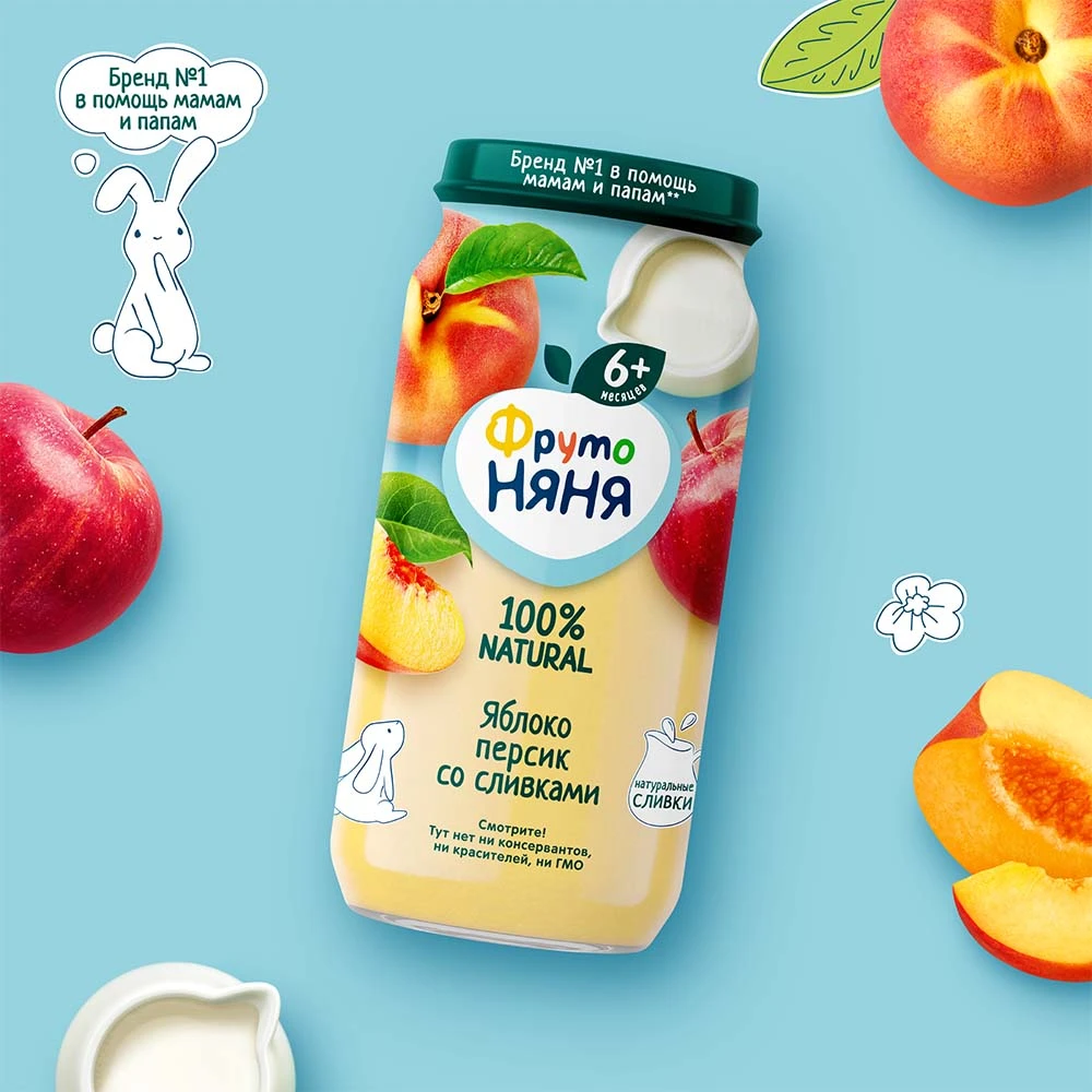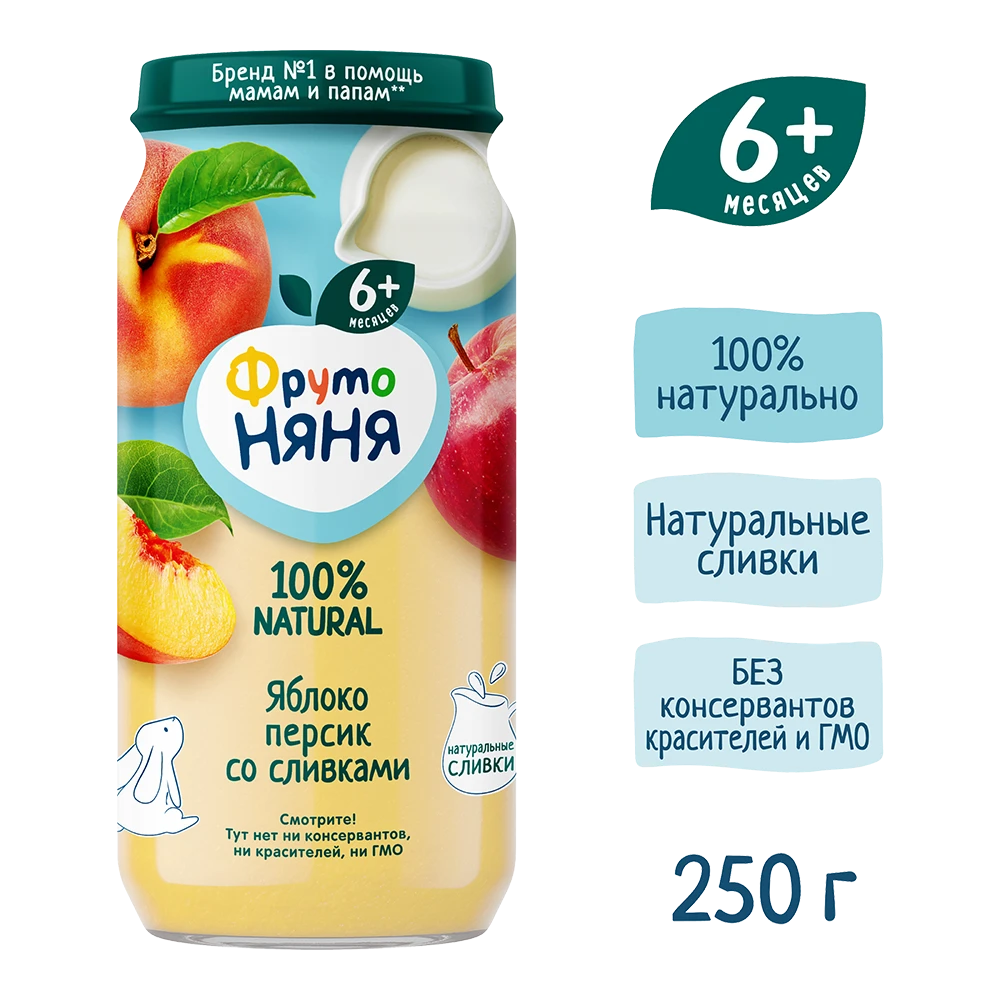 Пюре из яблок и персиков со сливками «ФрутоНяня» подходит для прикорма детей с 6 месяцев и разнообразит их рацион нежным вкусом сочных отборных фруктов и натуральных сливок. Пюре «ФрутоНяня» — это вкусный и питательный продукт, который подарит малышу отличное настроение и заряд энергии, чтобы он рос здоровым и активным. Упаковки объемом 250 мл хватит на несколько приемов. Открытую банку необходимо хранить в холодильнике.