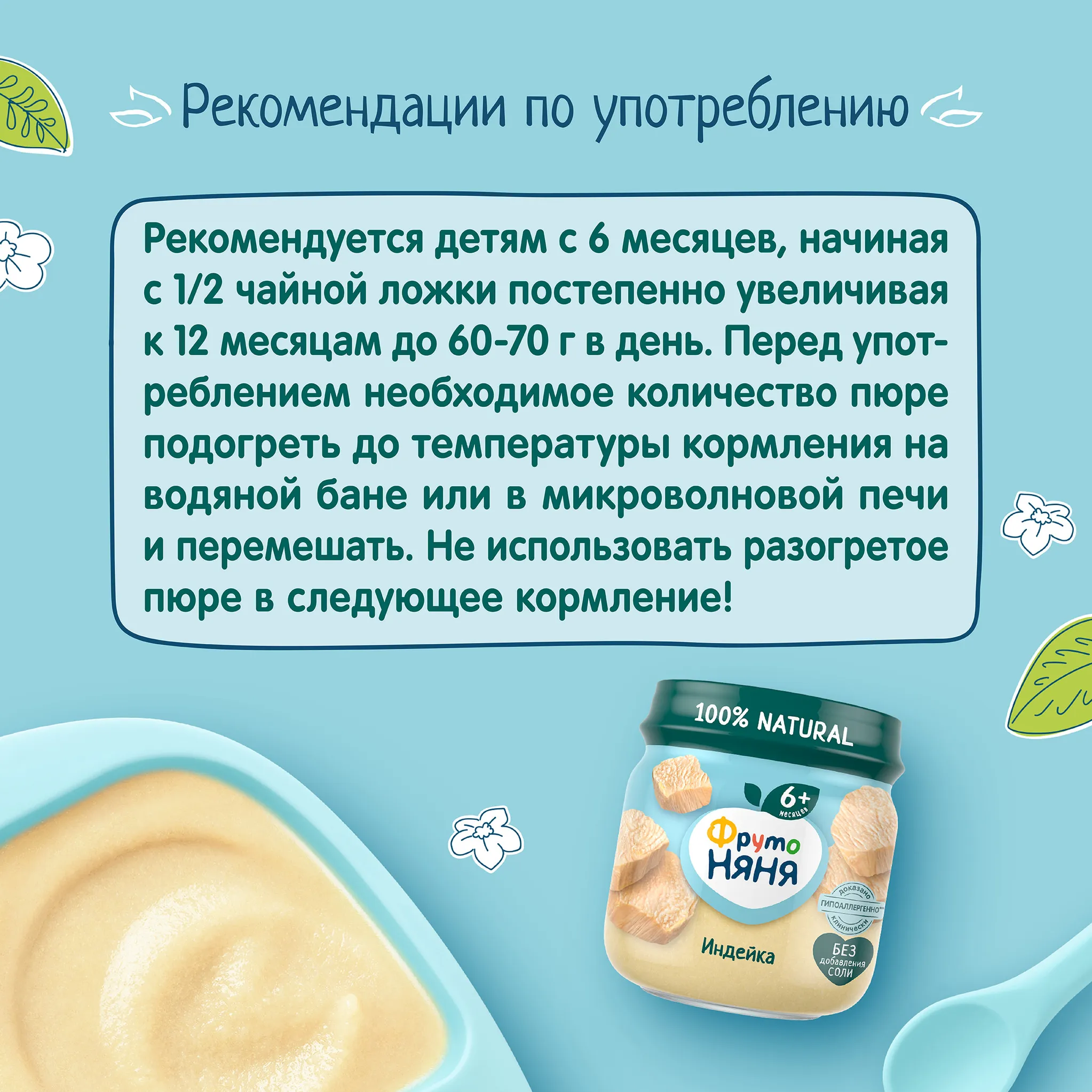 Пюре «ФрутоНяня» из телятины создано для того, чтобы поддержать здоровый рост малыша и развитие его организма. Состав, где содержатся только телятина и питьевая вода, подходит для продолжения мясного прикорма с 6 месяцев: строительным материалом для детского организма станут белок и незаменимые аминокислоты, которые есть в мясных продуктах. Мы не добавляем в детские пюре ничего лишнего — в них нет красителей, консервантов и соли.