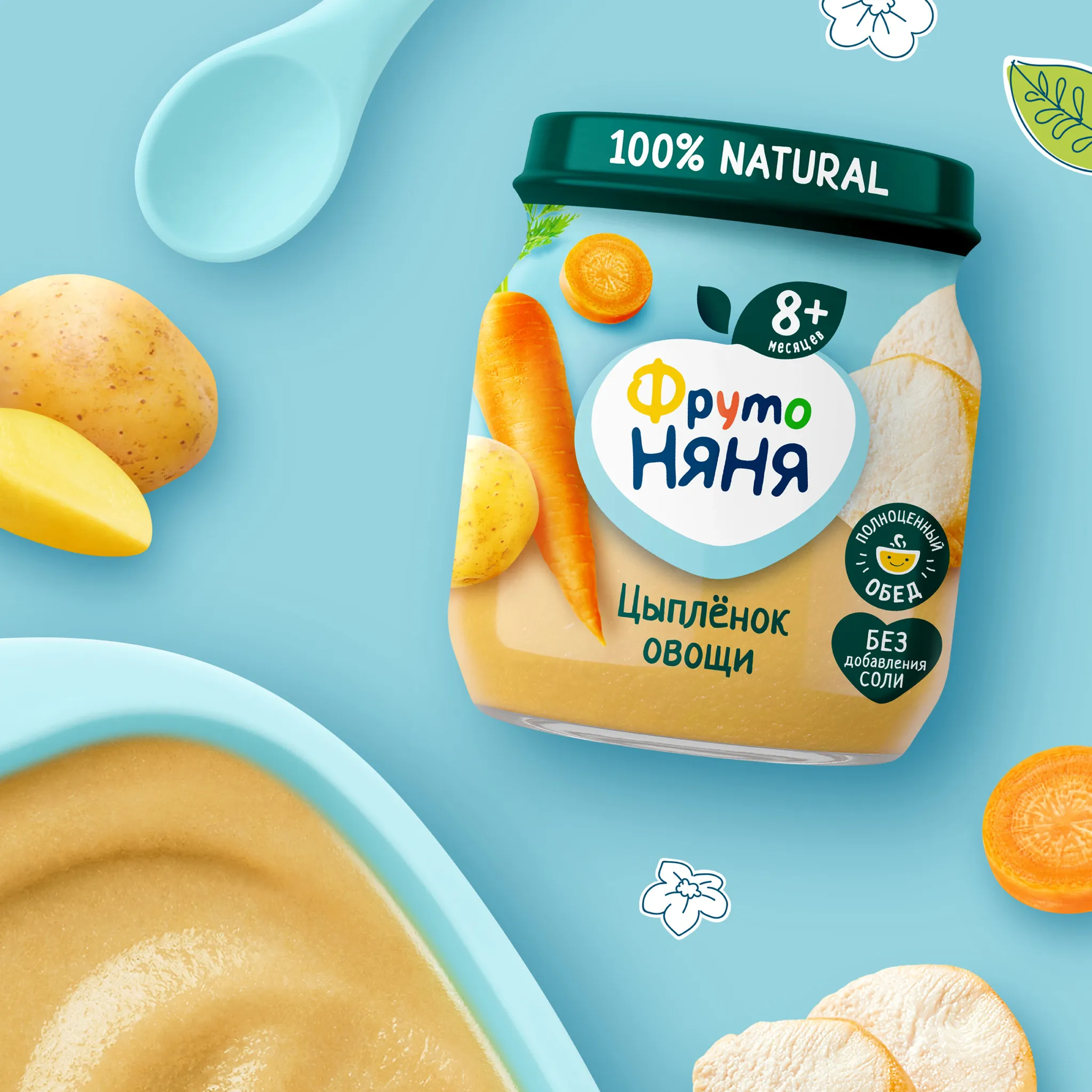 Пюре «ФрутоНяня» из цыпленка с овощами — это полноценный прием пищи ребенка в возрасте от 8 месяцев. Предложите мясо-растительное пюре малышу в качестве обеда или ужина, чтобы зарядить его энергией и отличным настроением. В состав входят только натуральные компоненты, обогащенные белком, витаминами и минеральными веществами: мясо цыпленка, отборные овощи — морковь и картофель. Поэтому пюре из мяса и овощей «ФрутоНяня» такое вкусное, полезное и точно понравится вашему малышу.
