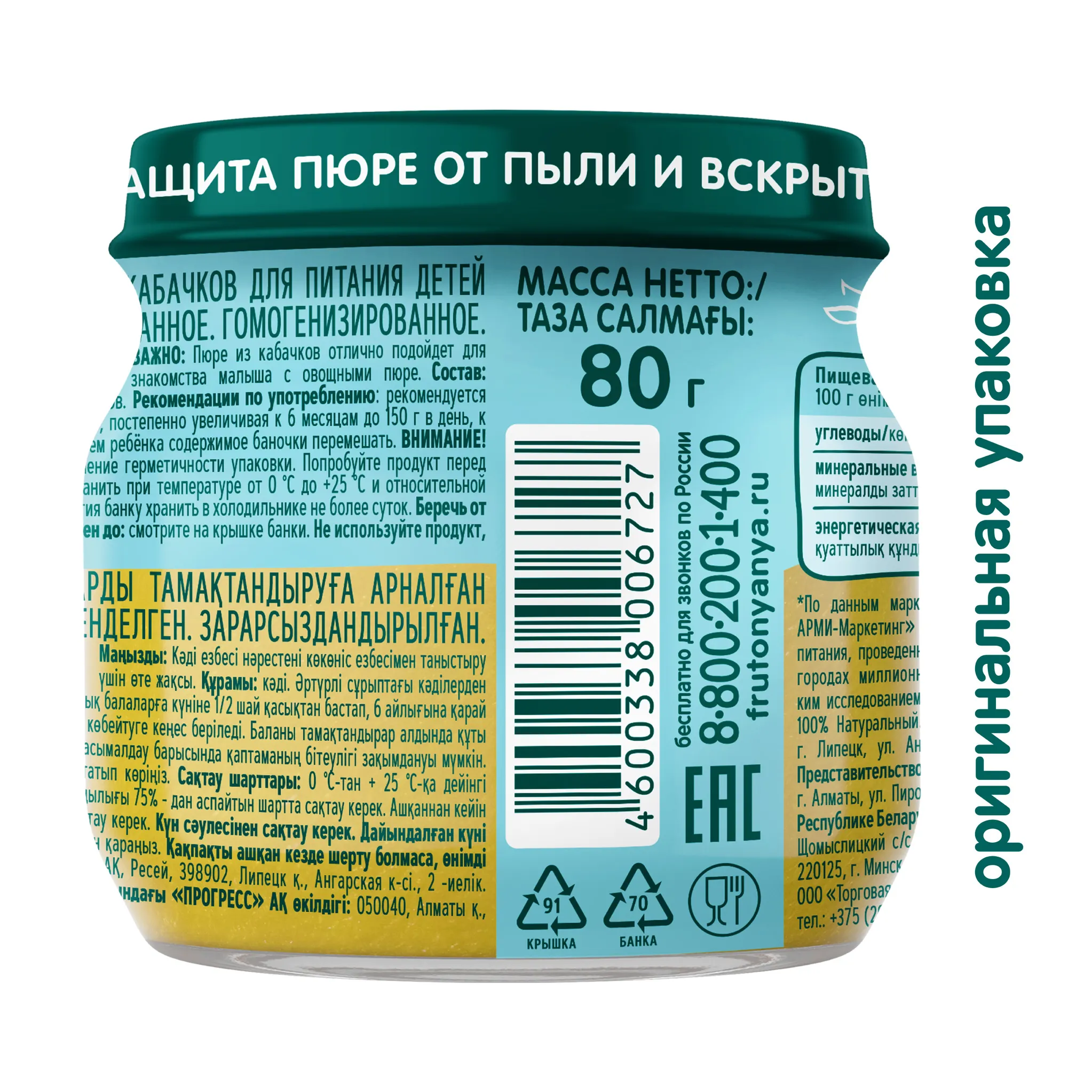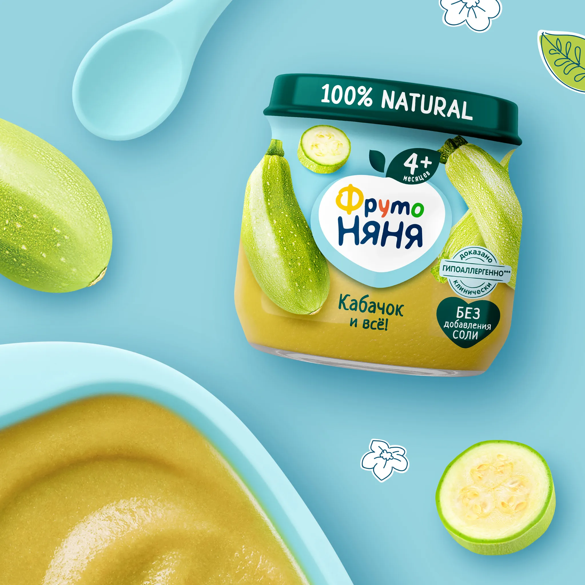 Овощное пюре из кабачков «ФрутоНяня» идеально подходит для малышей уже с 4 месяцев, которые только начинают знакомство с первым прикормом. Это детское питание имеет полностью натуральный состав: только овощи, которые мы отбираем с особым вниманием, и питьевая вода. Кабачковое пюре «ФрутоНяня» откроет малышу новый натуральный вкус без консервантов, красителей и соли, а мамам даст уверенность в выборе первого прикорма! Гипоаллергенность доказана клинически.