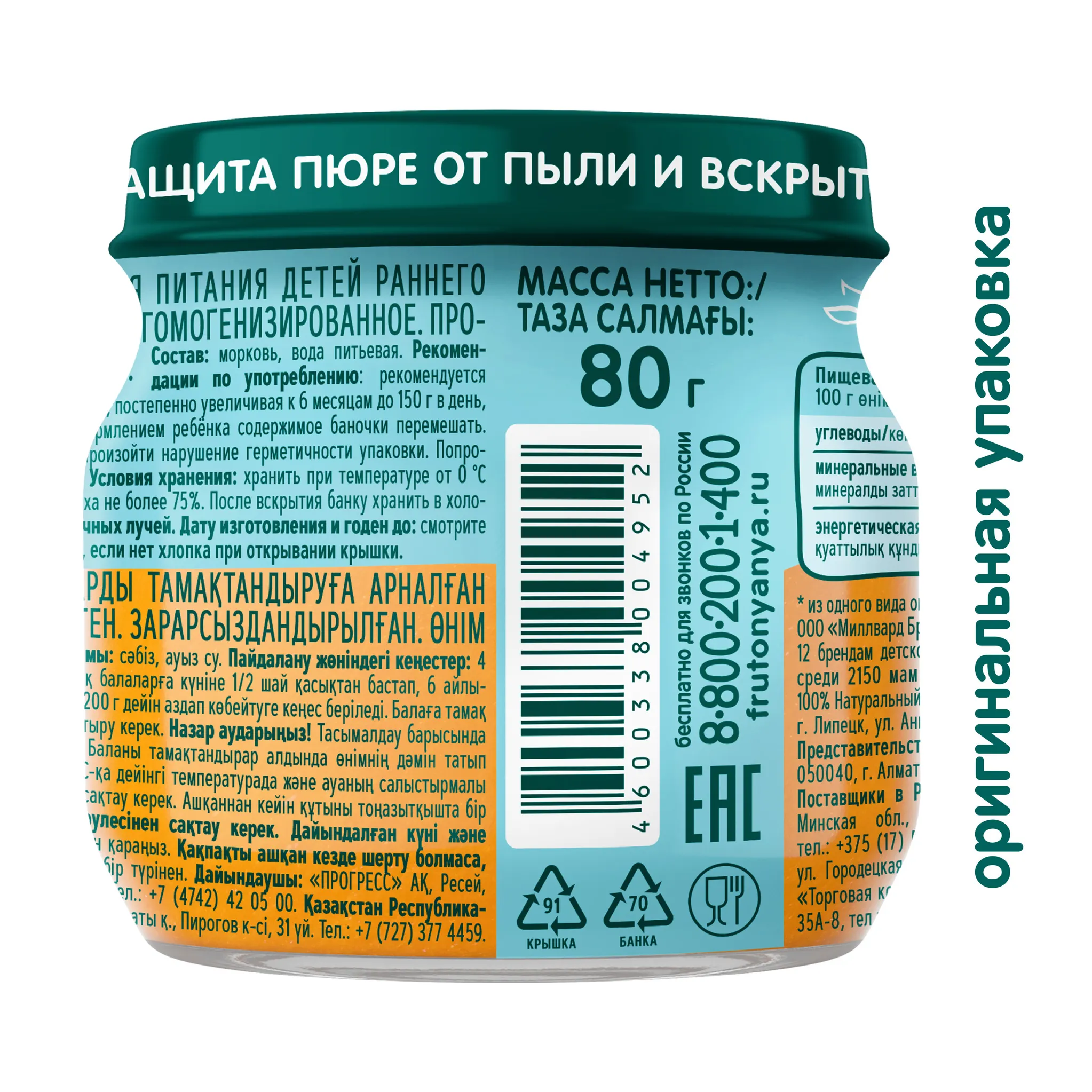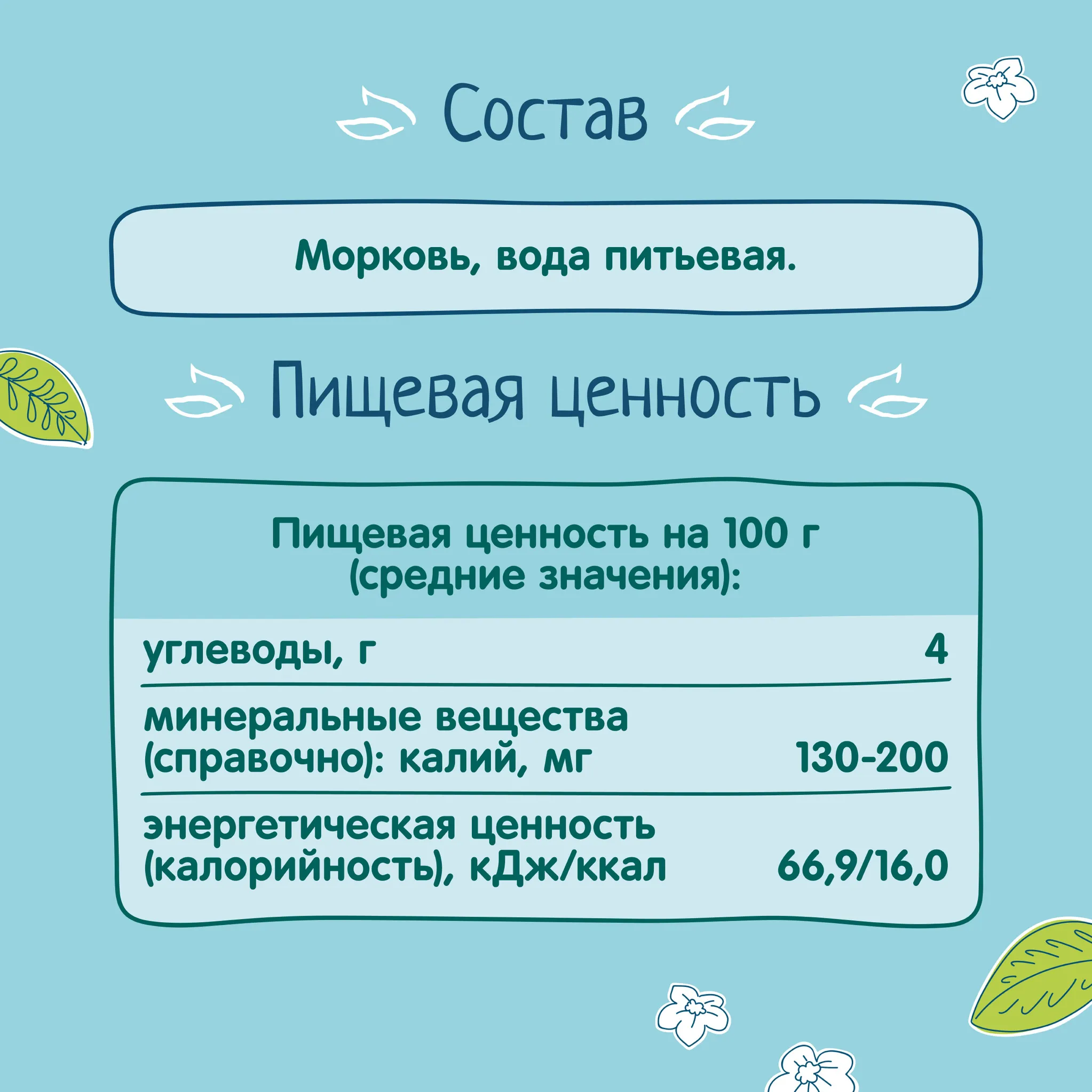Морковное пюре «ФрутоНяня» подойдет для малышей, которые продолжают знакомиться с овощами. И новым ингредиентом для малыша станет морковь! Овощи составляют важную часть рациона ребенка, поэтому мамам нужно знать, какие из них подходят в качестве прикорма лучше всего. В составе пюре «ФрутоНяня» нет крахмала, красителей, консервантов и соли — только морковь и питьевая вода.