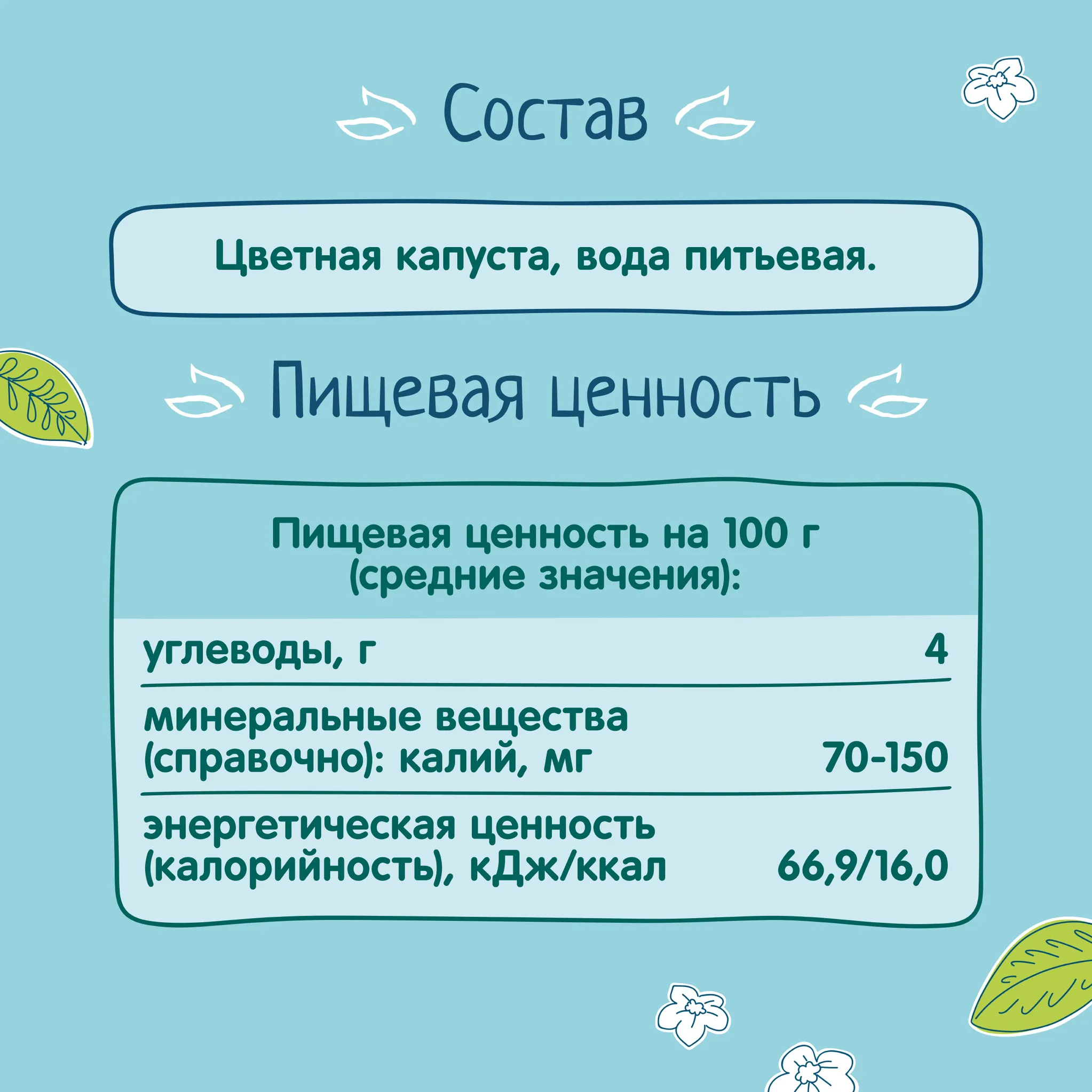 Пюре из цветной капусты «ФрутоНяня» имеет идеальный состав, чтобы начать первый прикорм малыша и его знакомство с новыми продуктами. Вводить в рацион этот овощ можно уже с 4 месяцев, ведь клинически доказано, что он гипоаллергенный. Мы не добавляем в наши пюре ничего лишнего: в них нет консервантов, красителей и ароматизаторов, а также соли и крахмала. В составе только цветная капуста и питьевая вода.