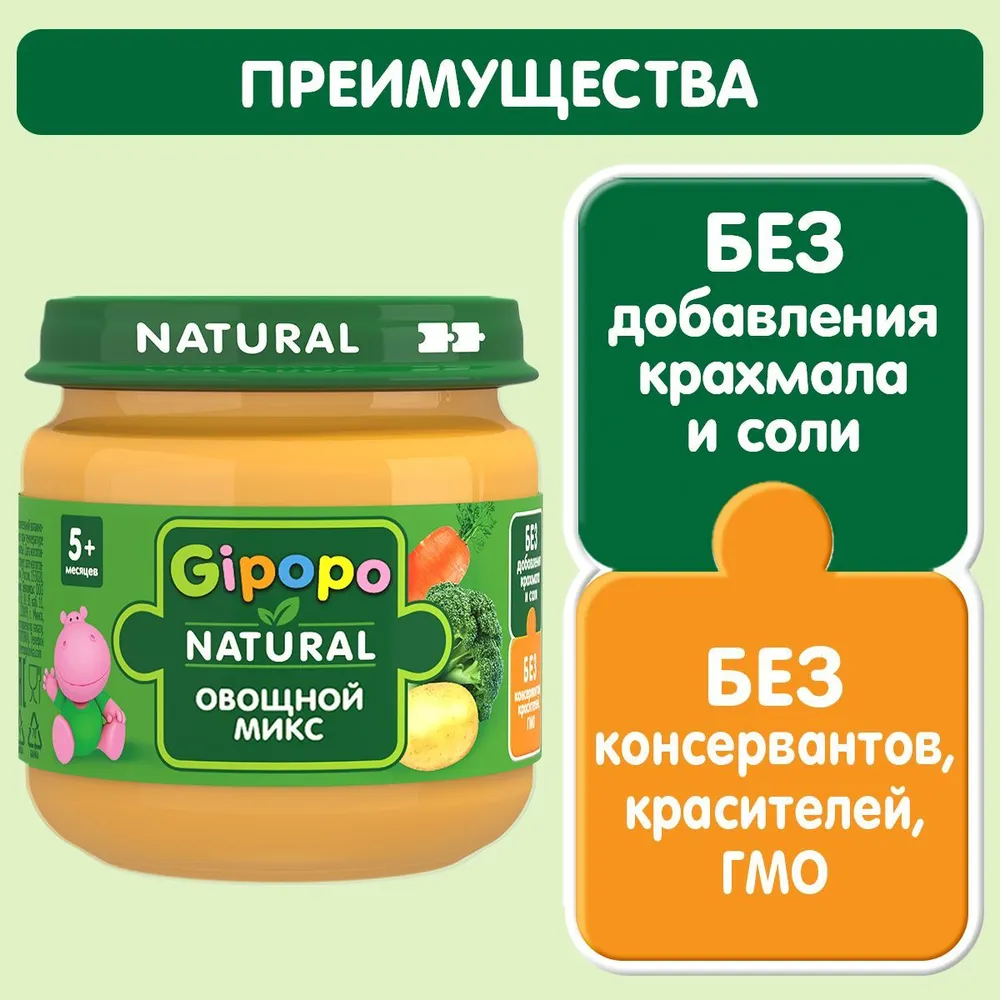 Пюре овощное детское GIPOPO «Овощной микс» создано для прикорма малышей с 5 месяцев.
