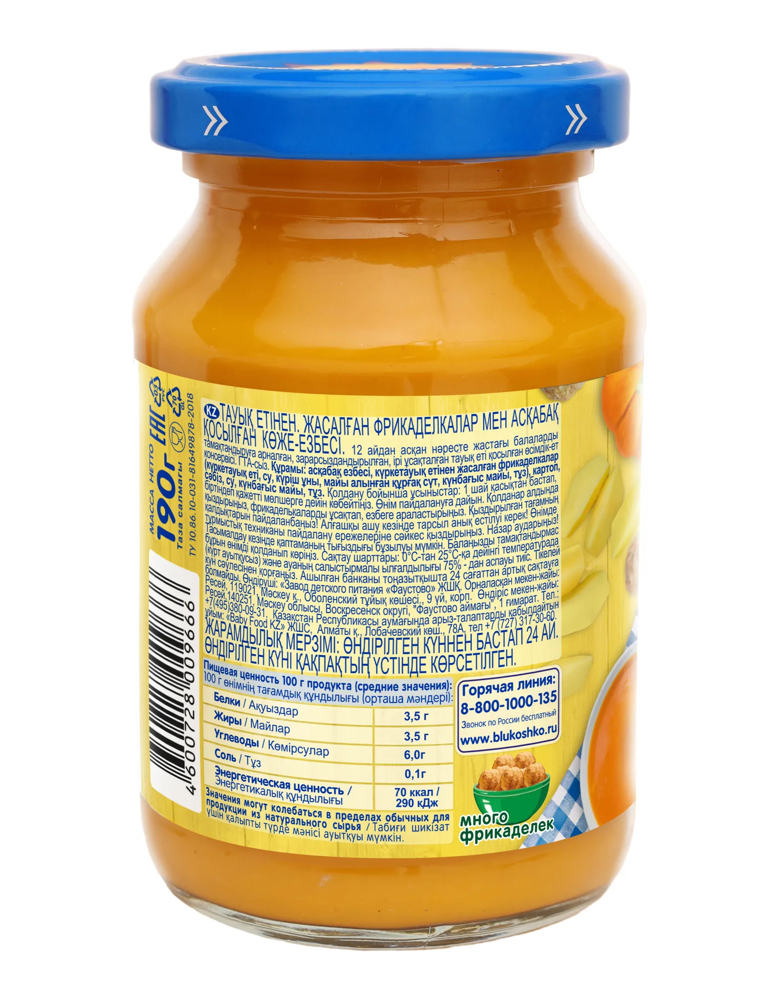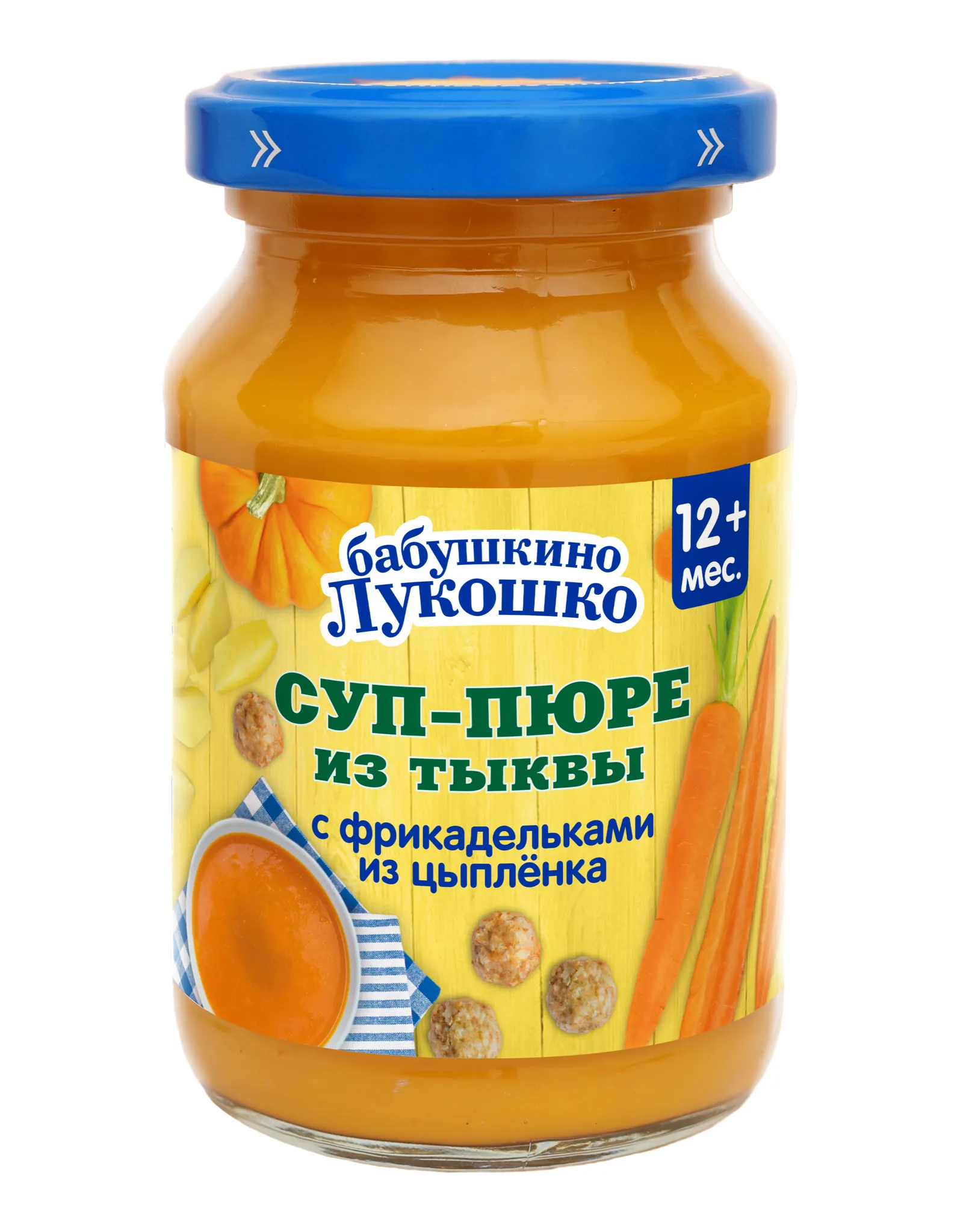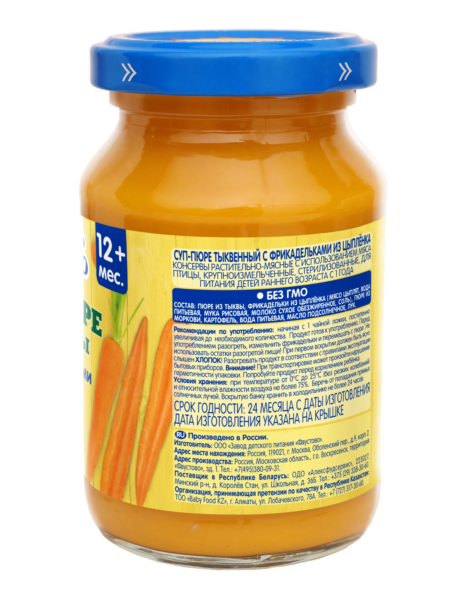 В состав продукта входит:пюре из тыквы, фрикадельки из цыпленка (мясо цыплят, вода питьевая, мука рисовая, молоко сухое обезжиренное, соль), пюре из моркови, картофель, вода питьевая, масло подсолнечное, лук.