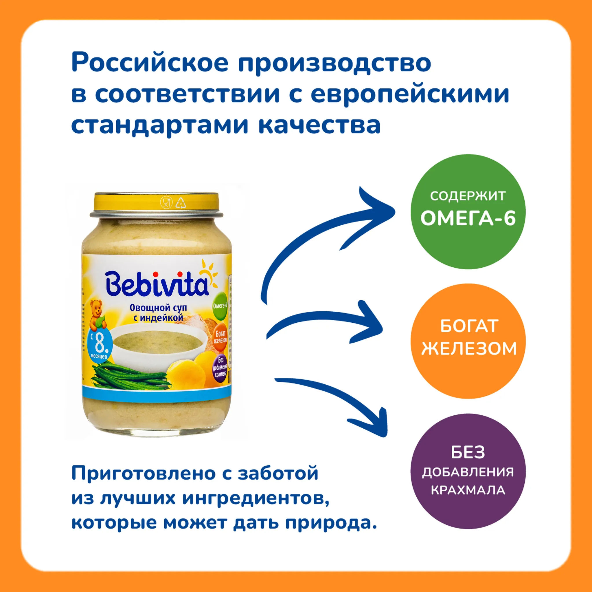 Овощной супчик Bebivita c индейкой, картофелем, фасолью и луком идеально подходит для продолжения прикорма детей с 8 месяцев.