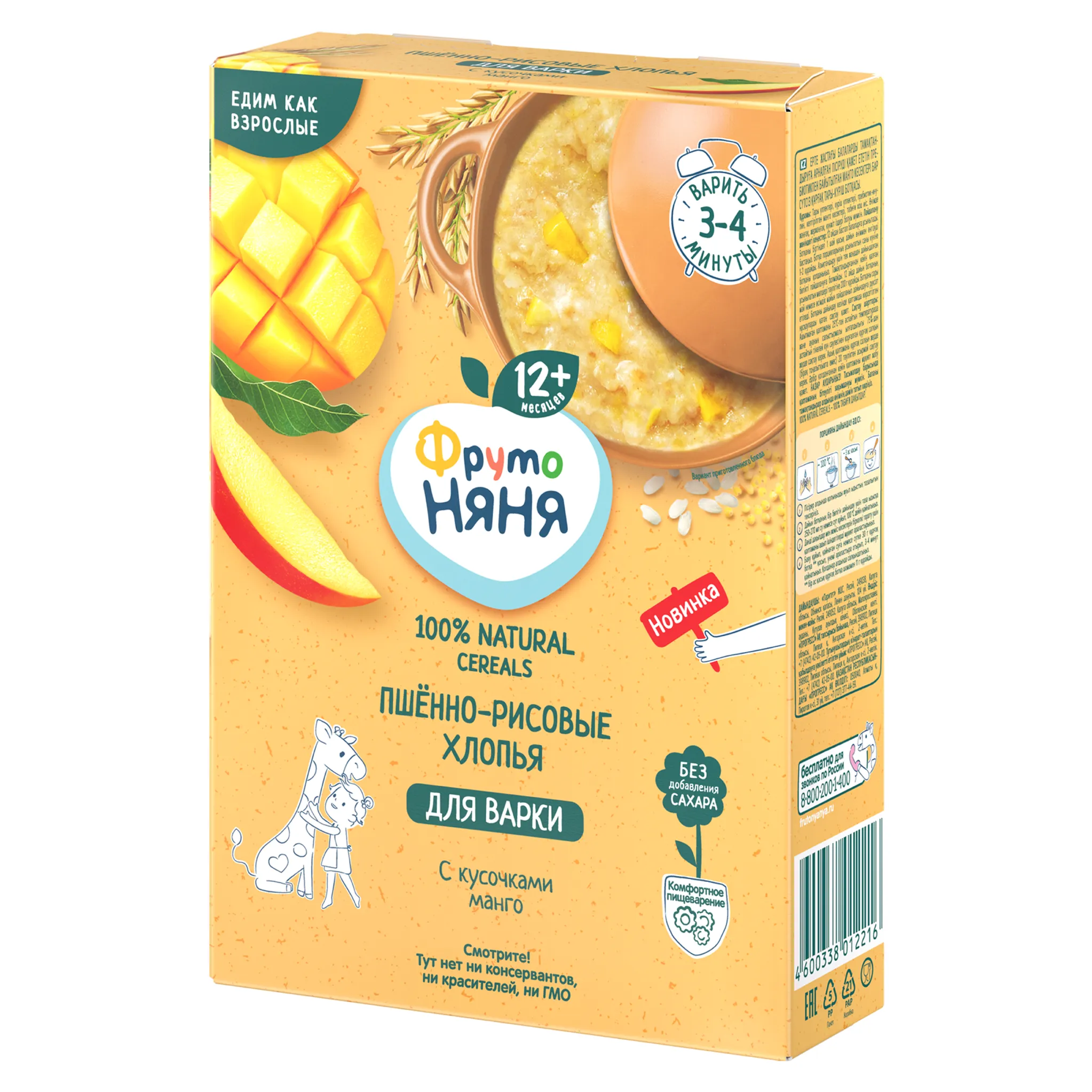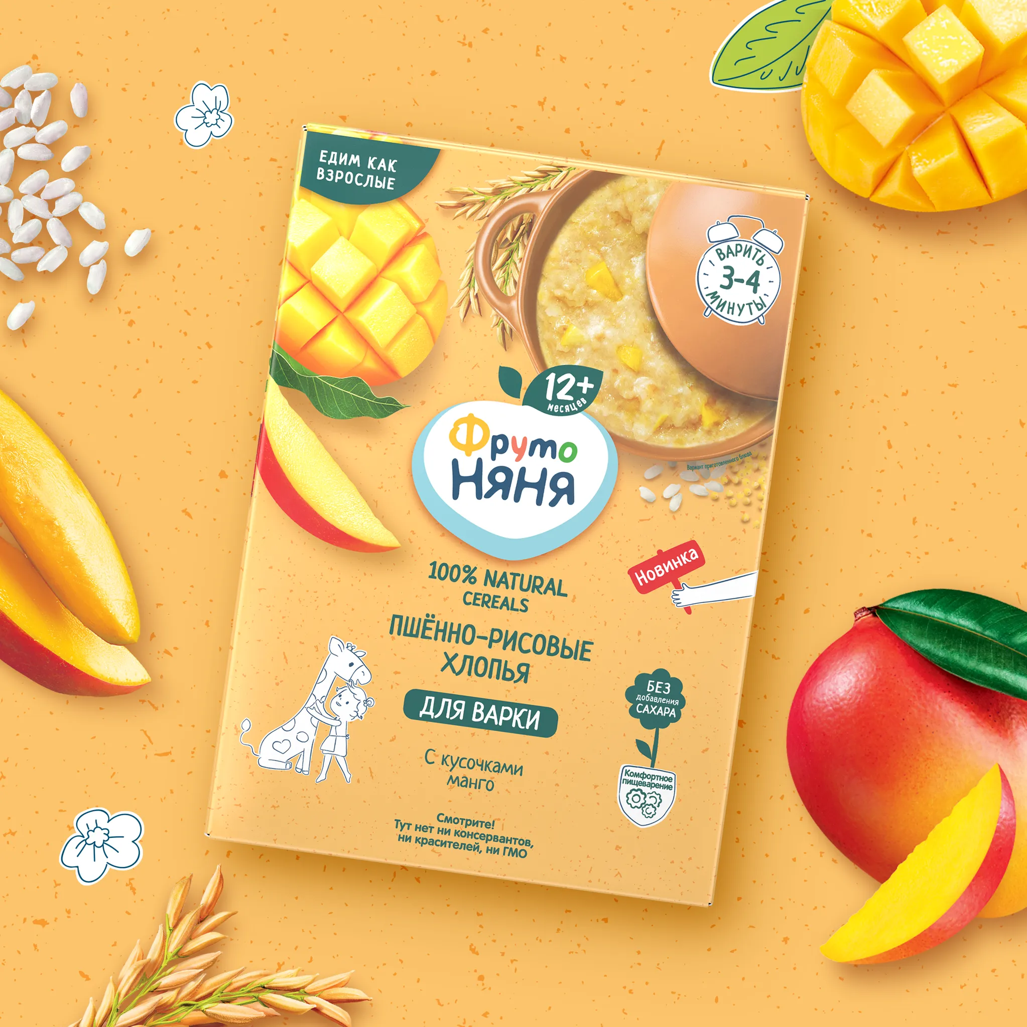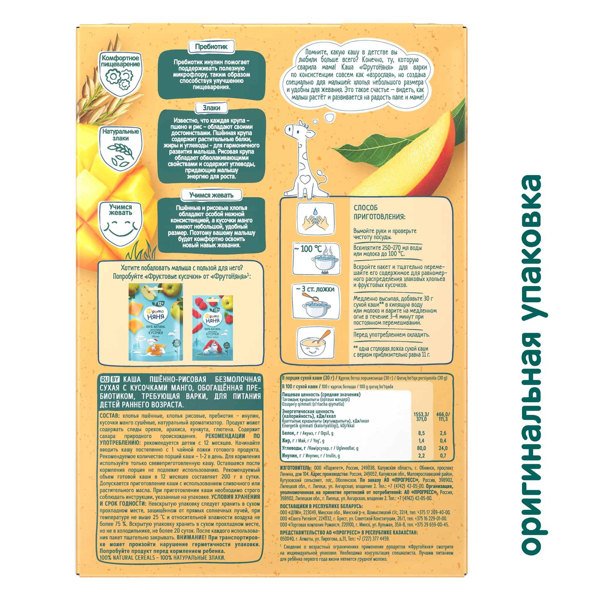 свойствами и содержит углеводы, придающие малышу энергию для роста. К тому же, пшённые и рисовые хлопья обладают особой нежной консистенцией, а кусочки манго имеют небольшой, удобный размер. Поэтому вашему малышу будет комфортно освоить новый навык жевания. А пребиотик инулин помогает поддерживать полезную микрофлору, таким образом способствует улучшения пищеварения.