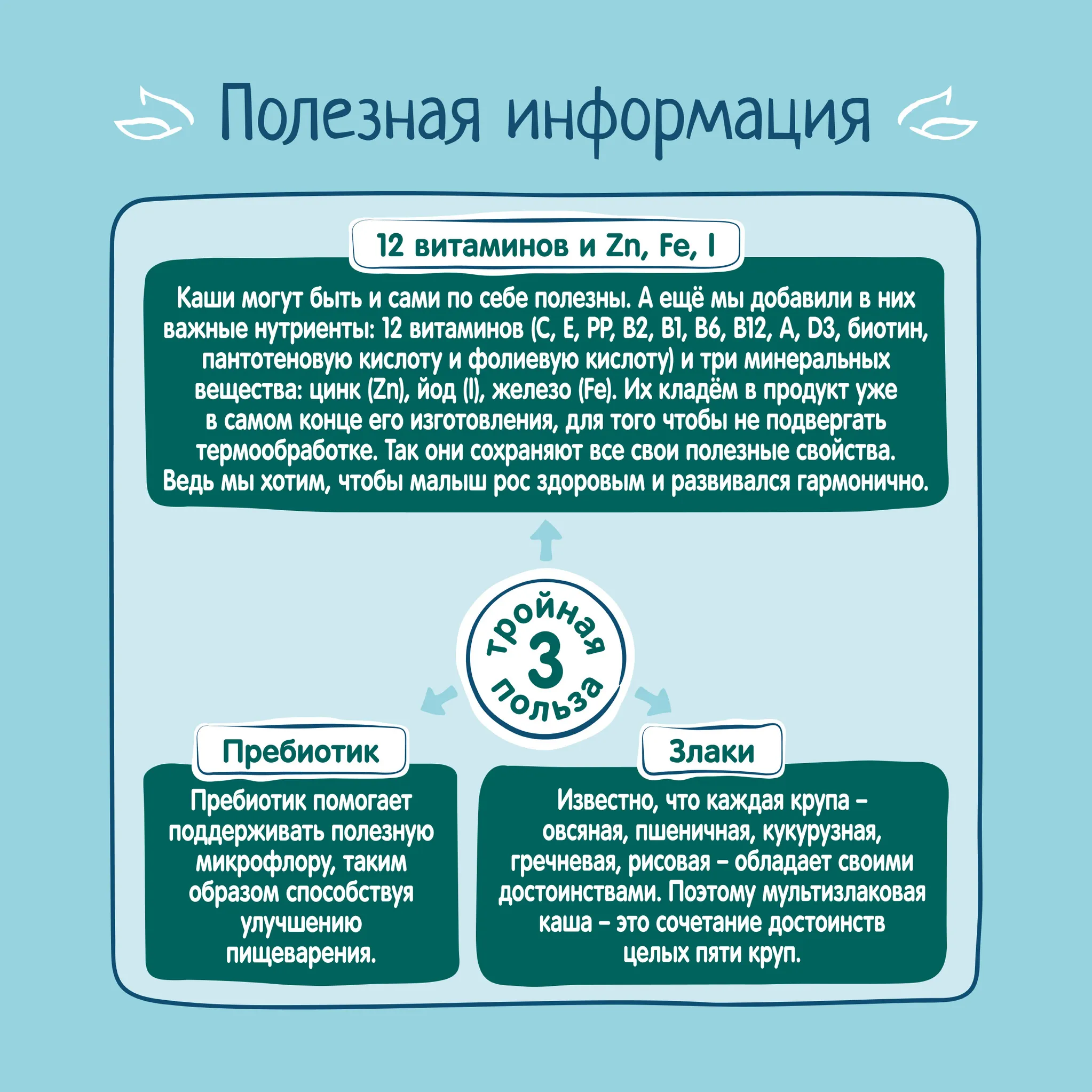 Мультизлаковая безмолочная каша «ФрутоНяня» разработана специально для прикорма детей в возрасте от 6 месяцев. Продукт поможет разнообразить рацион малышей и подойдет в качестве сытного полезного завтрака или ужина. Мультизлаковая каша «ФрутоНяня» обогащена витаминами и минералами для полноценного развития и роста детей, а также пребиотиками, которые способствуют комфортному пищеварению.