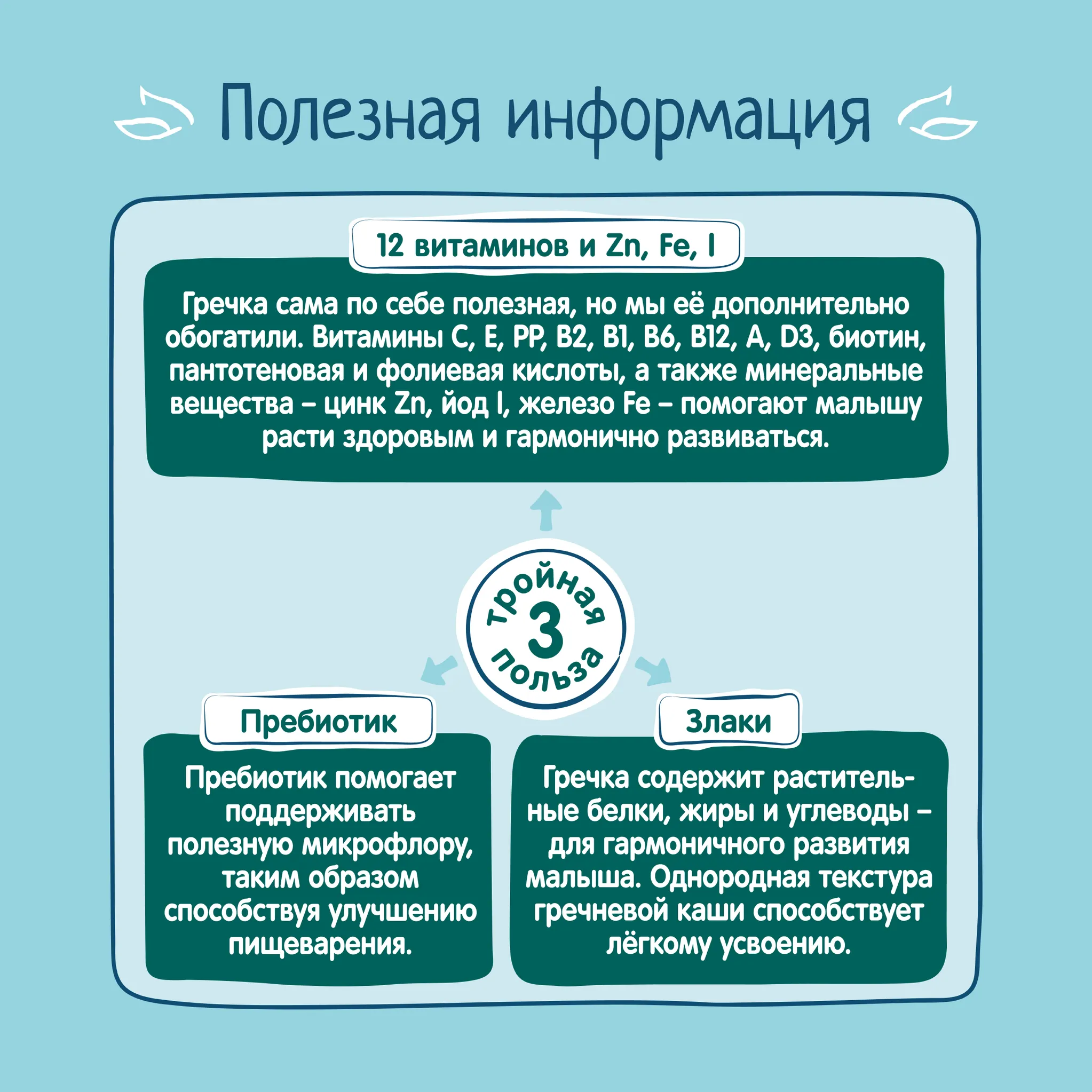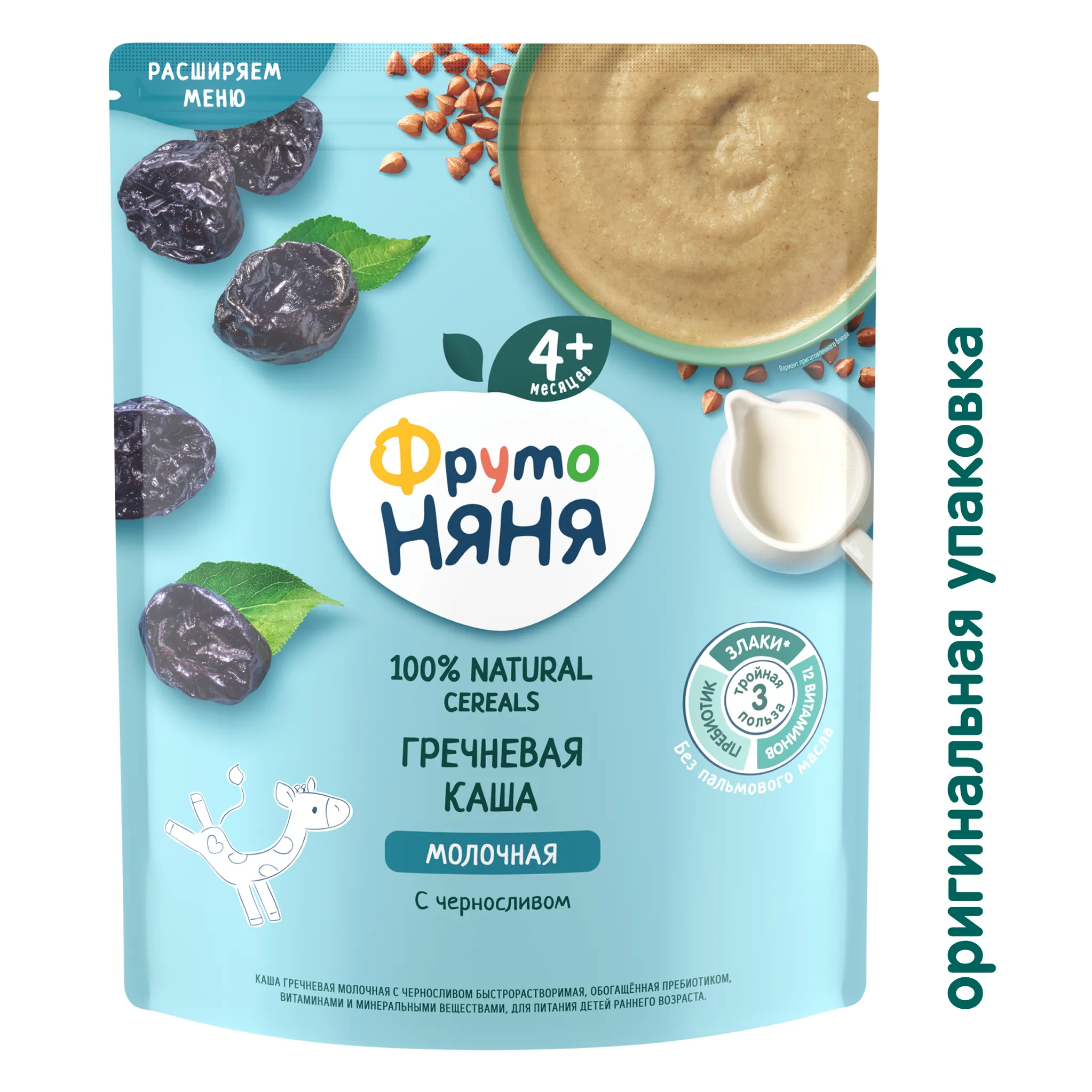 Сухая молочная гречневая каша «ФрутоНяня» с черносливом отлично подходит для первого прикорма детей от 4 месяцев. Ведь гречка — гипоаллергенный продукт, который идеально дополнит рацион малышей раннего возраста. Гречневая каша «ФрутоНяня» очень вкусная и полезная, ведь у нее натуральный состав без красителей, консервантов и ГМО. Она дополнительно обогащена целым комплексом витаминов и минеральных веществ, чтобы ваш малыш рос здоровым и энергичным, а также пребиотиком, улучшающим пищеварение.