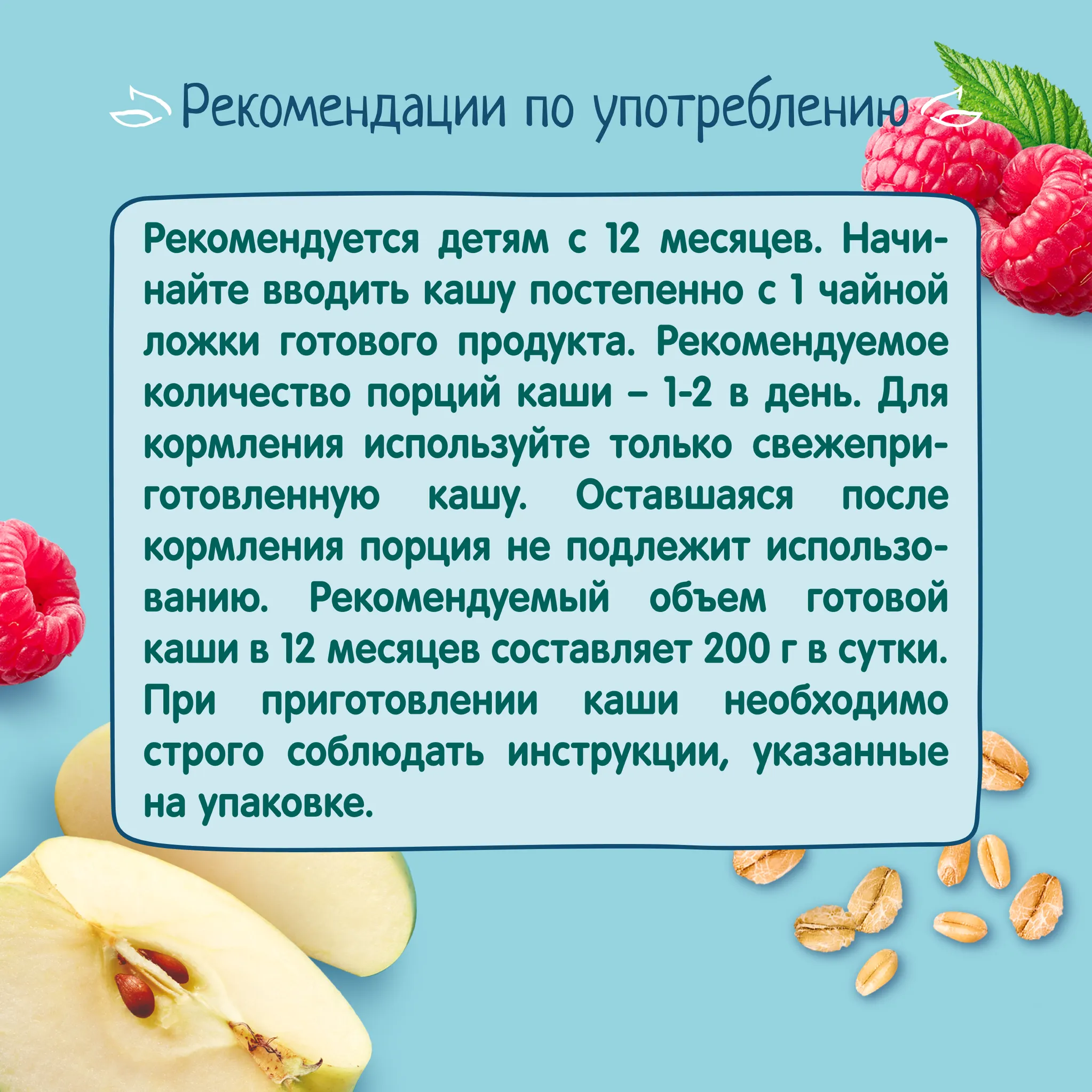 Мука пшеничная, молоко сухое обезжиренное, сахар, молоко сухое цельное, мука овсяная, продукт экструдированных круп и зернового сырья-кукурузные хлопья (крупа кукурузная, сахар, соль), масло кукурузное, мука кукурузная, пюре яблочное, кусочки малины сухие (малиновое пюре, сахароза, кукурузный крахмал), пребиотик – инулин, витамины (С, Е, РР, пантотеновая кислота, В2, В1, В6, А, фолиевая кислота, D3, биотин, В12), минеральные вещества (железо, цинк, йод)