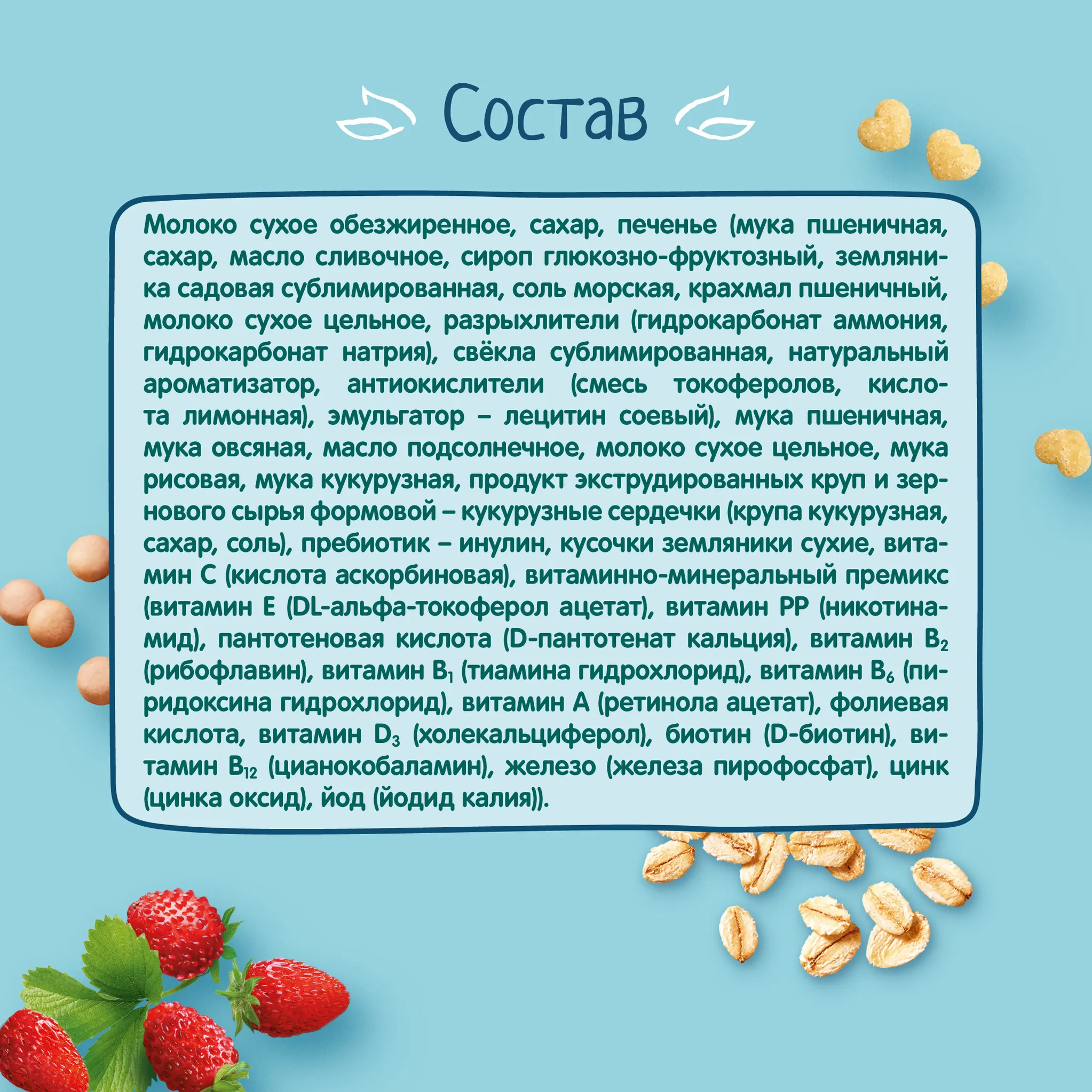 Сухая молочная мультизлаковая каша с земляничным печеньем, кукурузными сердечками и кусочками земляники «ФрутоНяня» — вкусный и полезный завтрак для детей старше 12 месяцев. В составе натуральные злаки, кусочки спелой земляники, земляничное печенье и кукурузные сердечки, которые обеспечивают сытость, развивают жевательные навыки и дарят новые сенсорные ощущения.