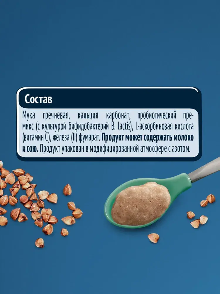 Мука гречневая, кальция карбонат, соль, витамин С ( L -аскорбиновая кислота), железа( II ) фумарат, бифидобактерии не менее 1х106 КОЕ/г. Продукт может содержать глютен, молоко и сою. Продукт упакован в модифицированной атмосфере с азотом