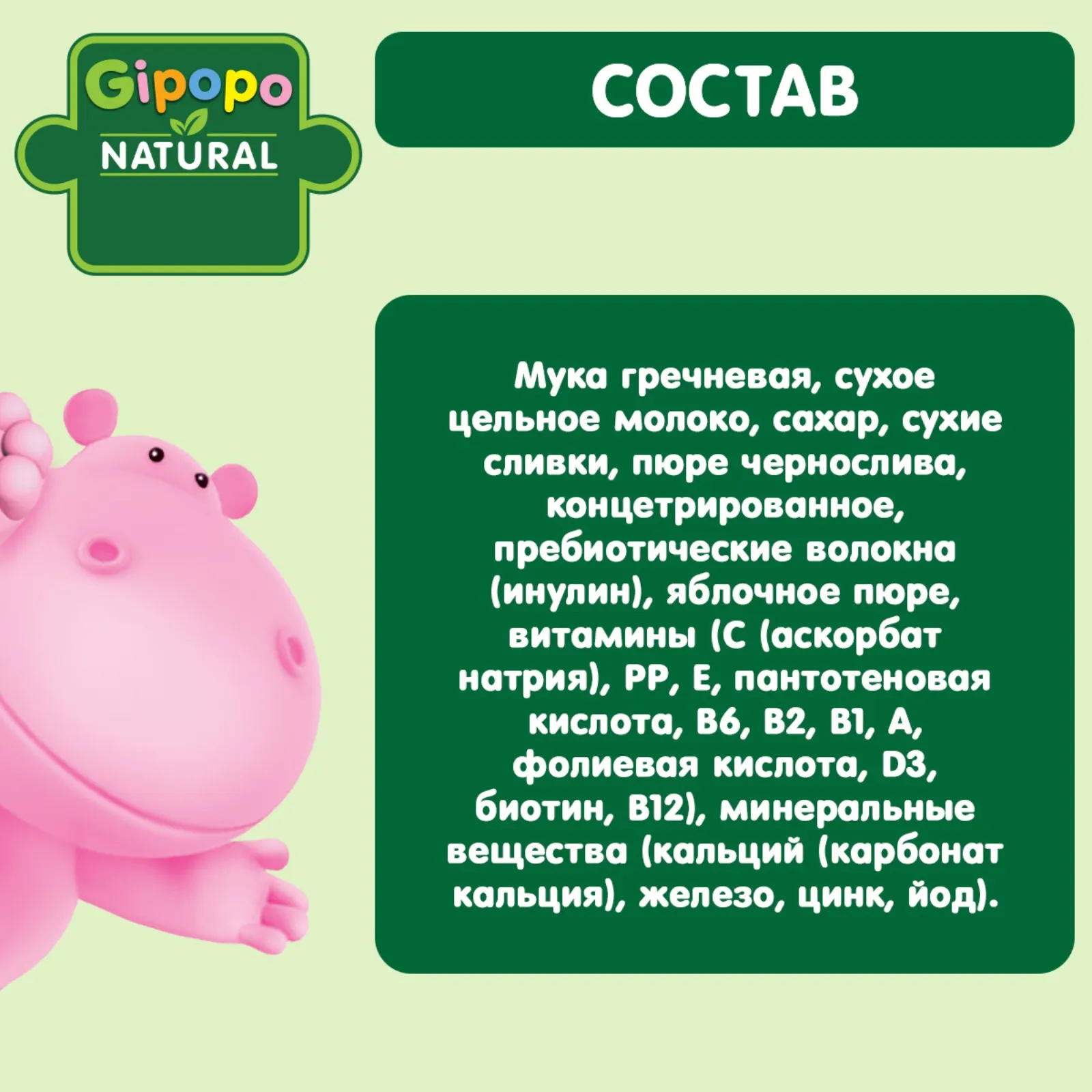 Мука гречневая,сахар, пюре концентрированного чернослива 30-32%, яблочное пюре, молоко сухое обезжиренное, масло подсолнечное высокоолеиновое, карбонат кальция, витамины: (С (аскорбат натрия), РР, Е, пантотеновая кислота, В6, В2, В1, А, фолиевая кислота, D3, D-биотин, В12), минеральные вещества: железо, цинк, йод)