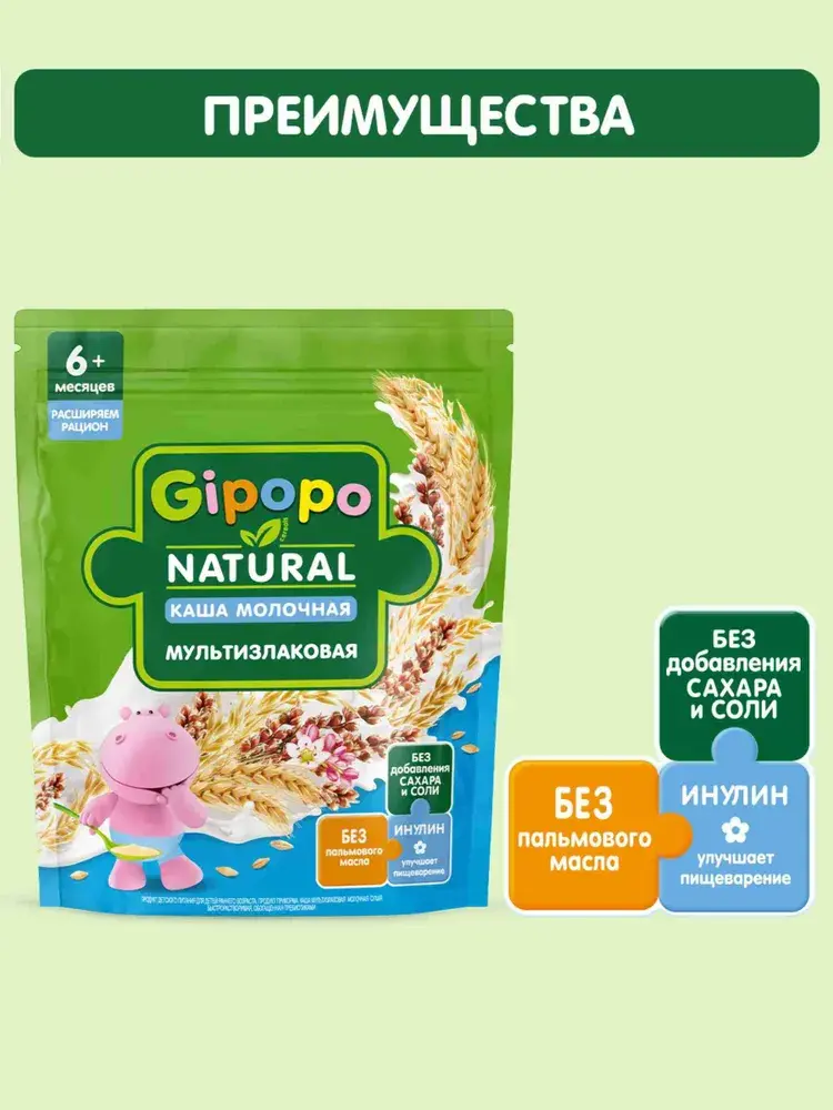 Каша молочная детская мультизлаковая GIPOPO оптимально подходит для постепенного знакомства малыша с новыми сочетаниями. В ее состав входят несколько зерновых культур, они дают энергию и всё необходимое для роста и развития.