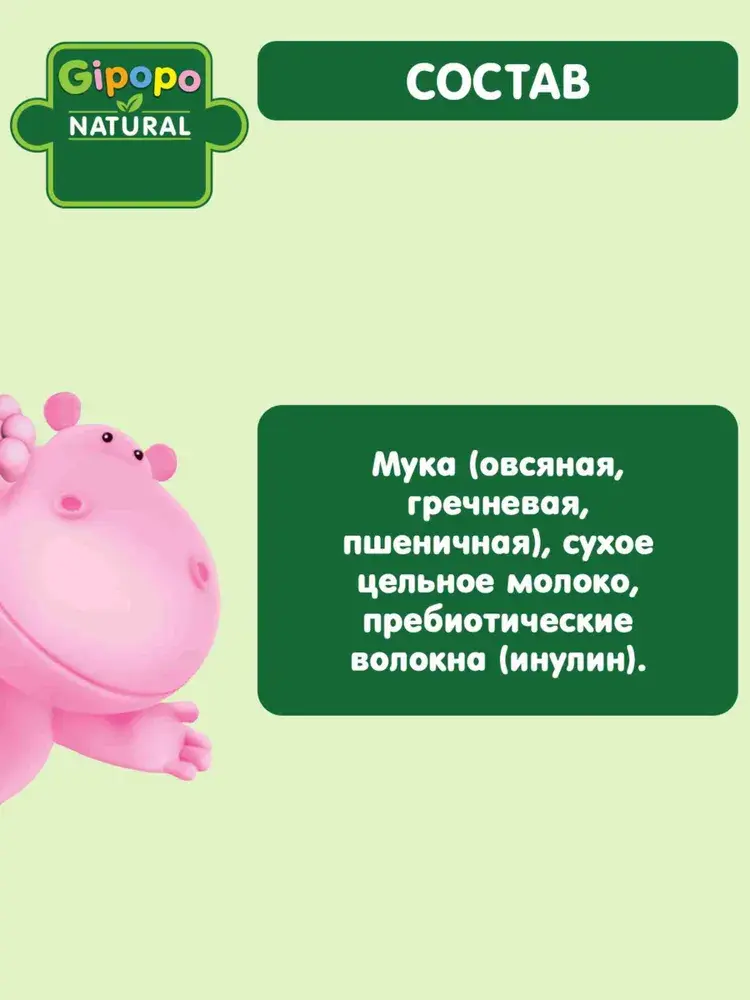 Мука (овсяная, гречневая, пшеничная), сухое цельное молоко, пребиотические волокна (инулин). Содержит сахара природного (естественного) происхождения.