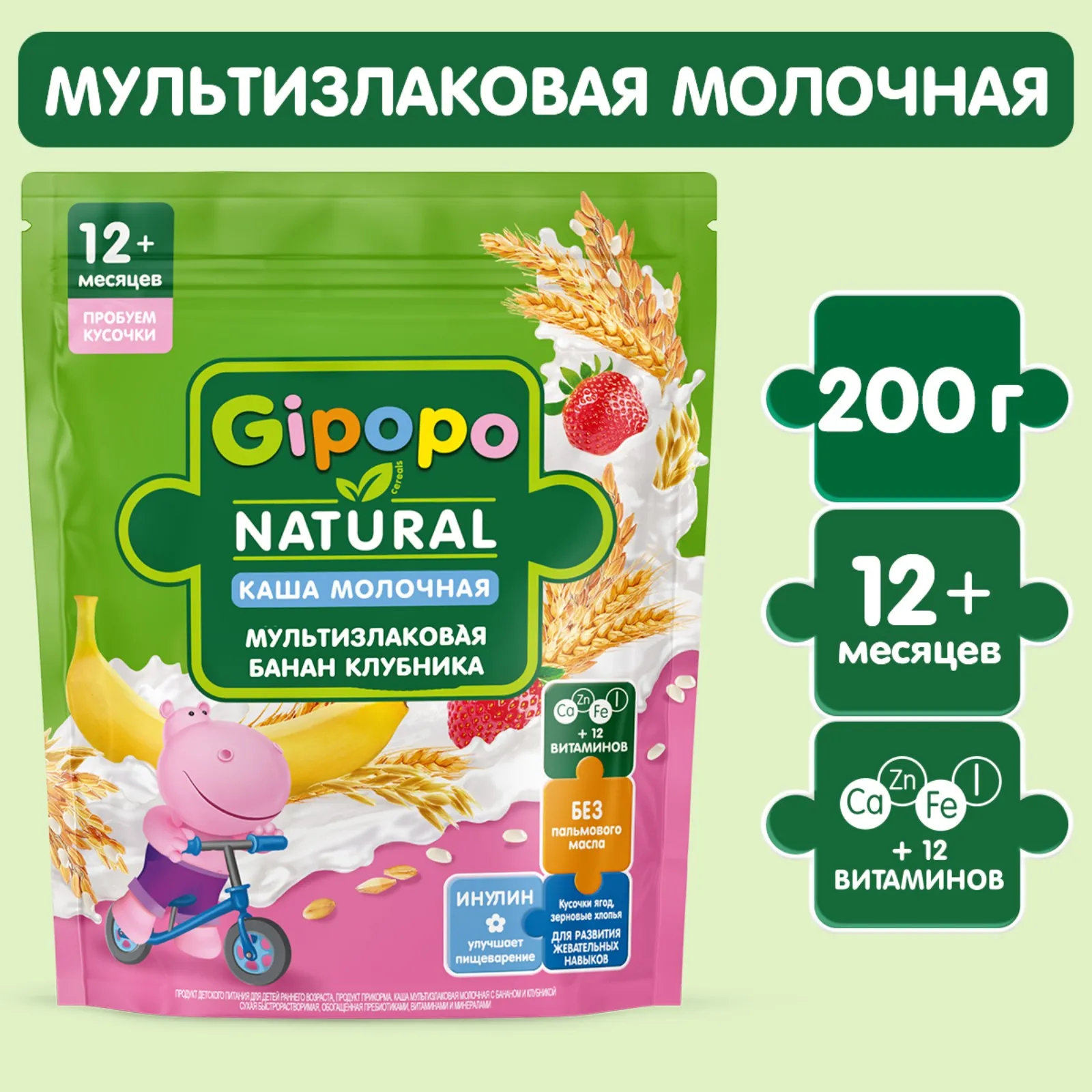 Каша детская молочная фруктовая мультизлаковая GIPOPO с кусочками клубники и овсяными хлопьями разработана специально для малышей с 12 месяцев.