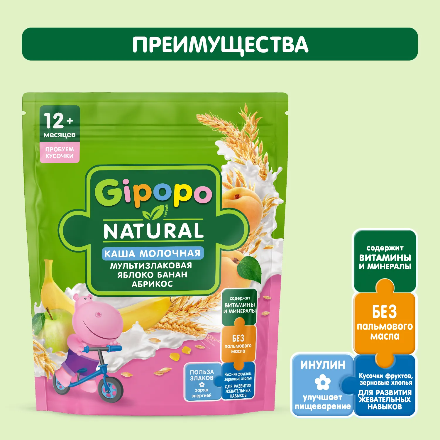 С 12 месяцев малыш активно развивает навыки жевания. Каши GIPOPO ПРОБУЕМ КУСОЧКИ содержат кусочки фруктов и зерновые хлопья для развития жевательных навыков малыша.