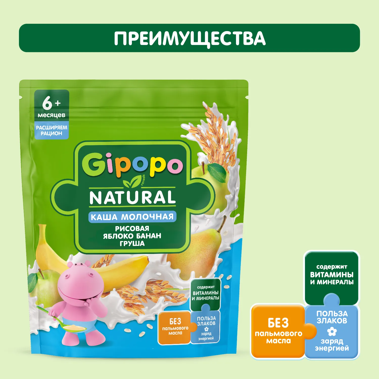 Молочная рисовая каша с фруктами GIPOPO РАСШИРЯЕМ РАЦИОН является источником белка и содержит всё необходимое для активного роста и развития малыша.