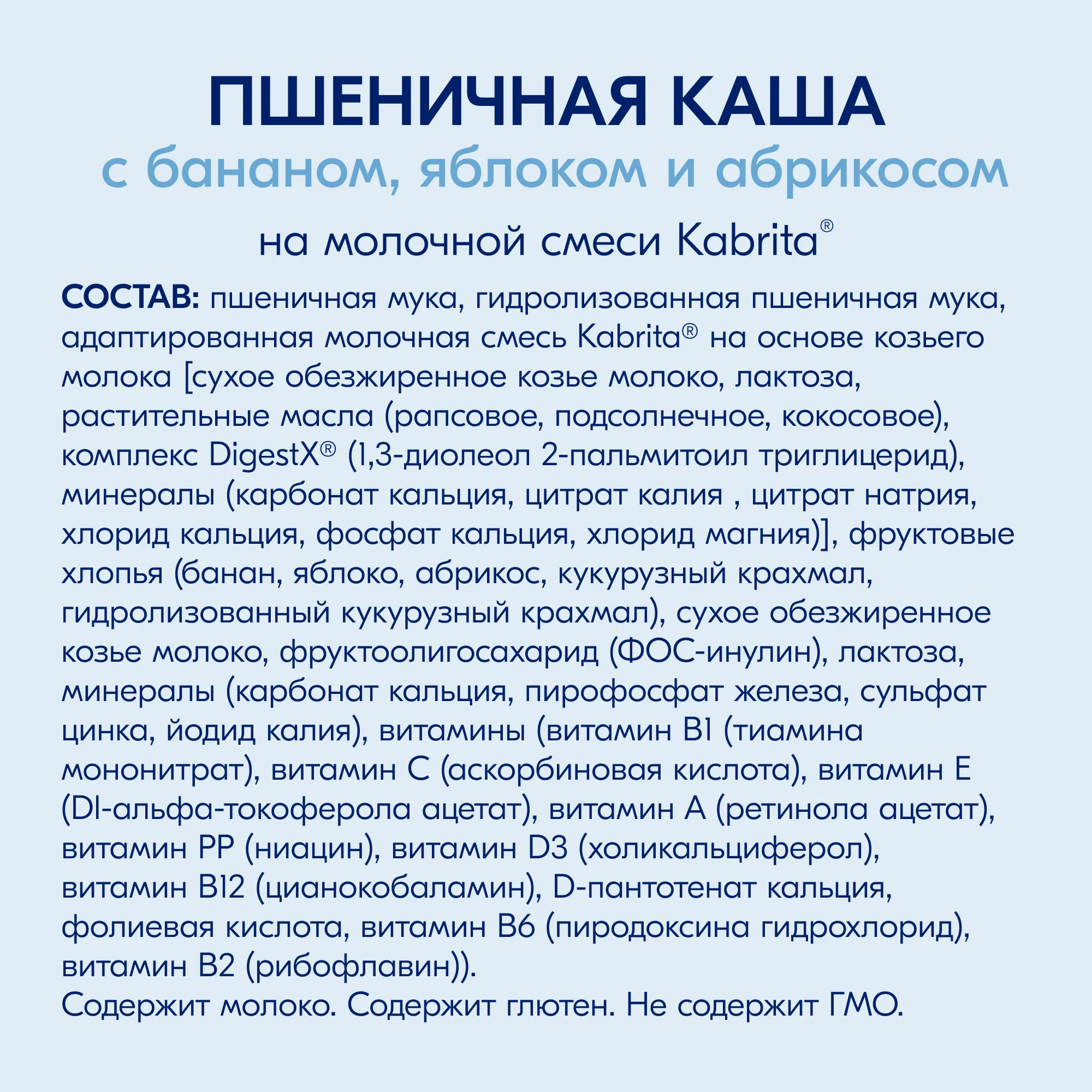 Пшеничная мука, гидролизованная пшеничная мука, адаптированная молочная смесь на основе козьего молока [сухое обезжиренное козье молоко, лактоза, растительные масла (рапсовое, подсолнечное, кокосовое), комплекс DigestX (1,3-диолеол 2-пальмитоил триглицерид), минералы (карбонат кальция, цитрат калия , цитрат натрия, хлорид кальция, фосфат кальция, хлорид магния)], фруктовые хлопья (банан , яблоко, абрикос, кукурузный крахмал, гидролизованный кукурузный крахмал), сухое обезжиренное козье молоко, фруктоолигосахарид (ФОС-инулин), лактоза, минералы (карбонат кальция, пирофосфат железа, сульфат цинка, йодид калия), витамины (витамин В1 (тиамина мононитрат), витамин С (аскорбиновая кислота), витамин Е (Dl-альфа-токоферола ацетат), витамин А (ретинола ацетат), витамин PP (ниацин), витамин D3 (холикальциферол), витамин В12 (цианокобаламин), D-пантотенат кальция, фолиевая кислота, витамин В6 (пиродоксина гидрохлорид), витамин В2 (рибофлавин)).