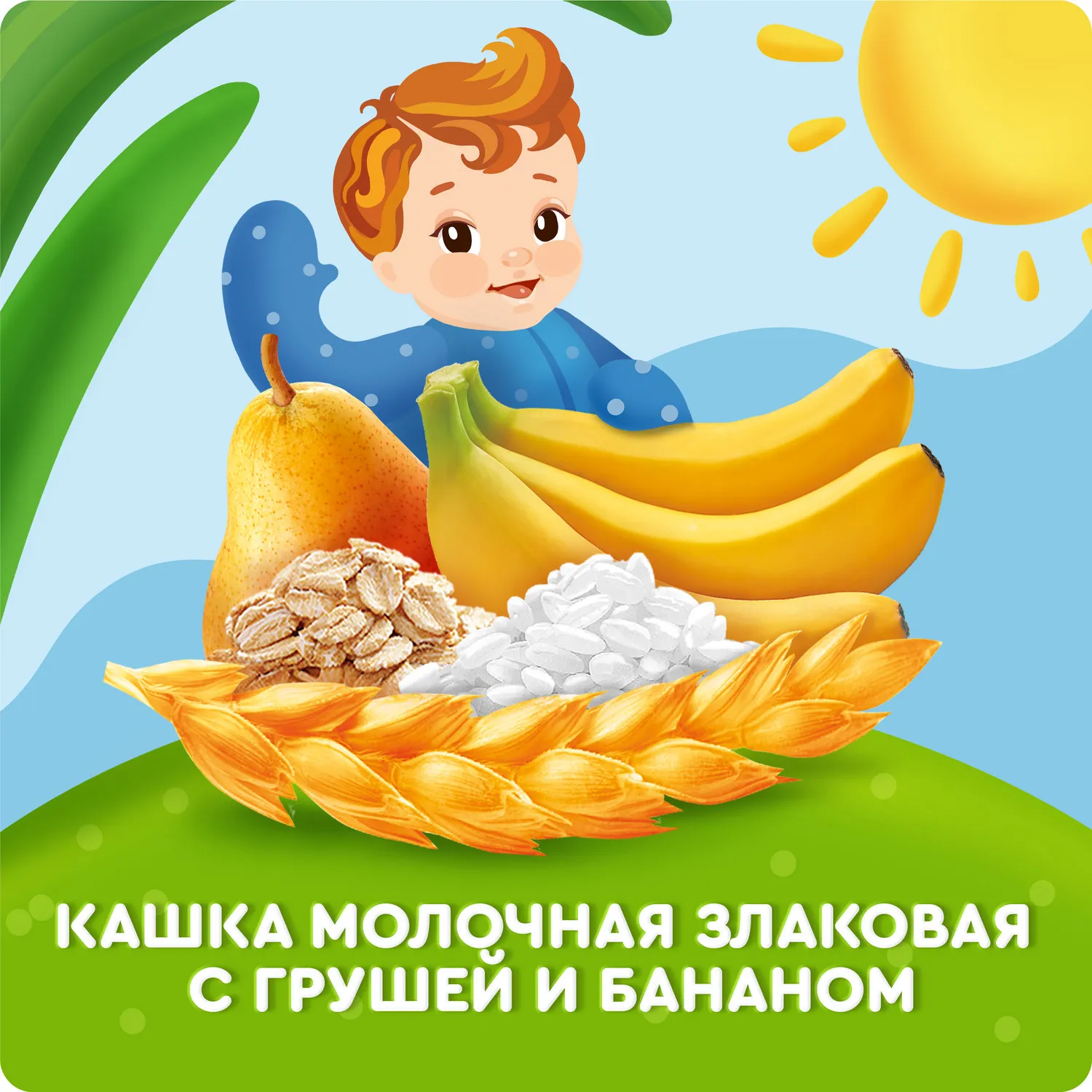 Молоко нормализованное, вода, мука (рисовая, пшеничная, овсяная), сахар, пребиотические вещества (олигофруктоза), ароматизаторы натуральные, фруктовые порошки (грушевый, банановый). Продукт содержит глютен.