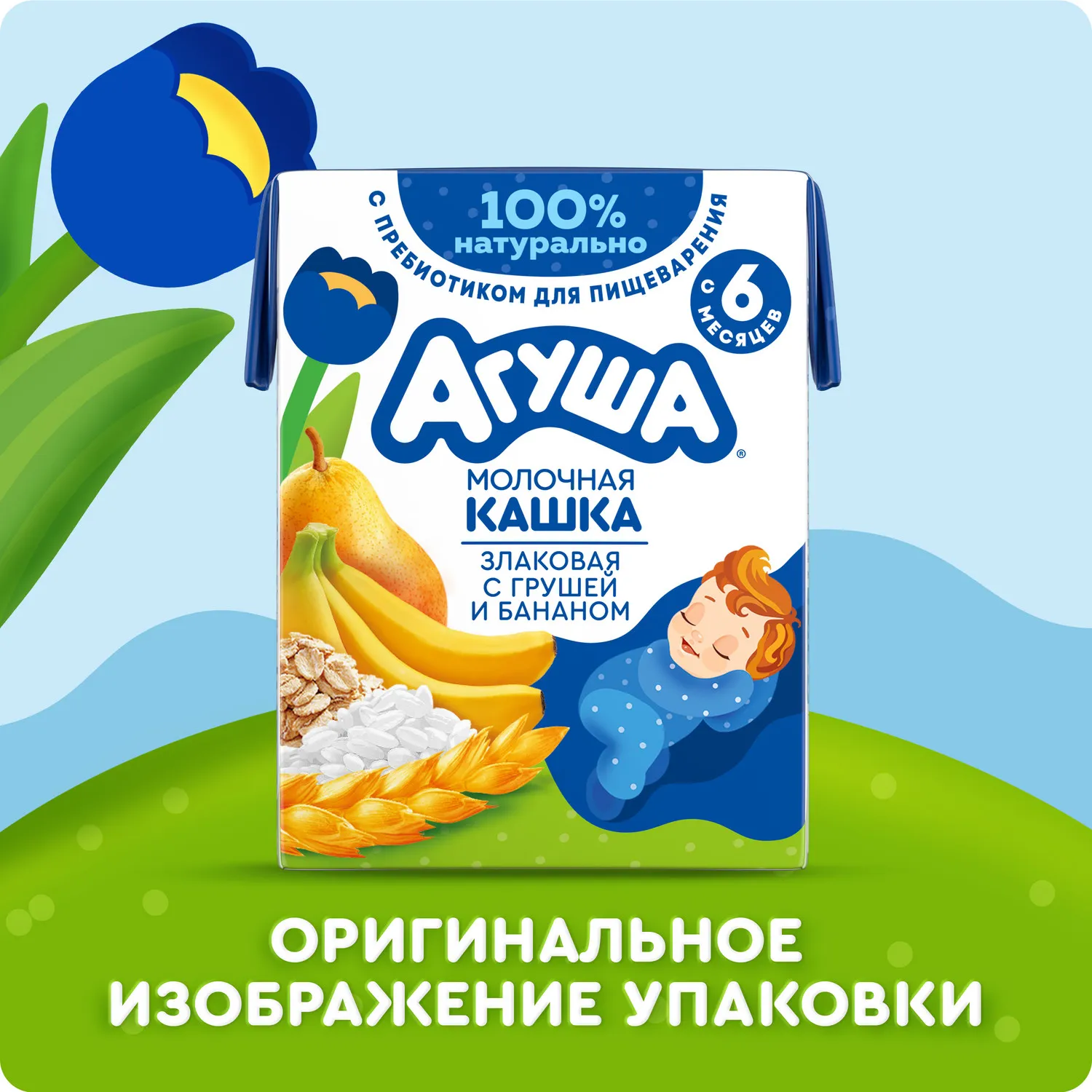 Жидкие готовые молочные каши «Агуша Засыпай-ка» разработаны специально для детей старше 6 месяцев и помогут подготовиться ко сну. Каша расширяет рацион малыша, учит его есть разнообразную по консистенции и вкусу пищу и привносит необходимые питательные вещества. Готовые кашки «Агуша Засыпай-ка» - это привычное малышу сочетание молока и злаков с фруктовым вкусом: яблоко-банан или груша-банан.