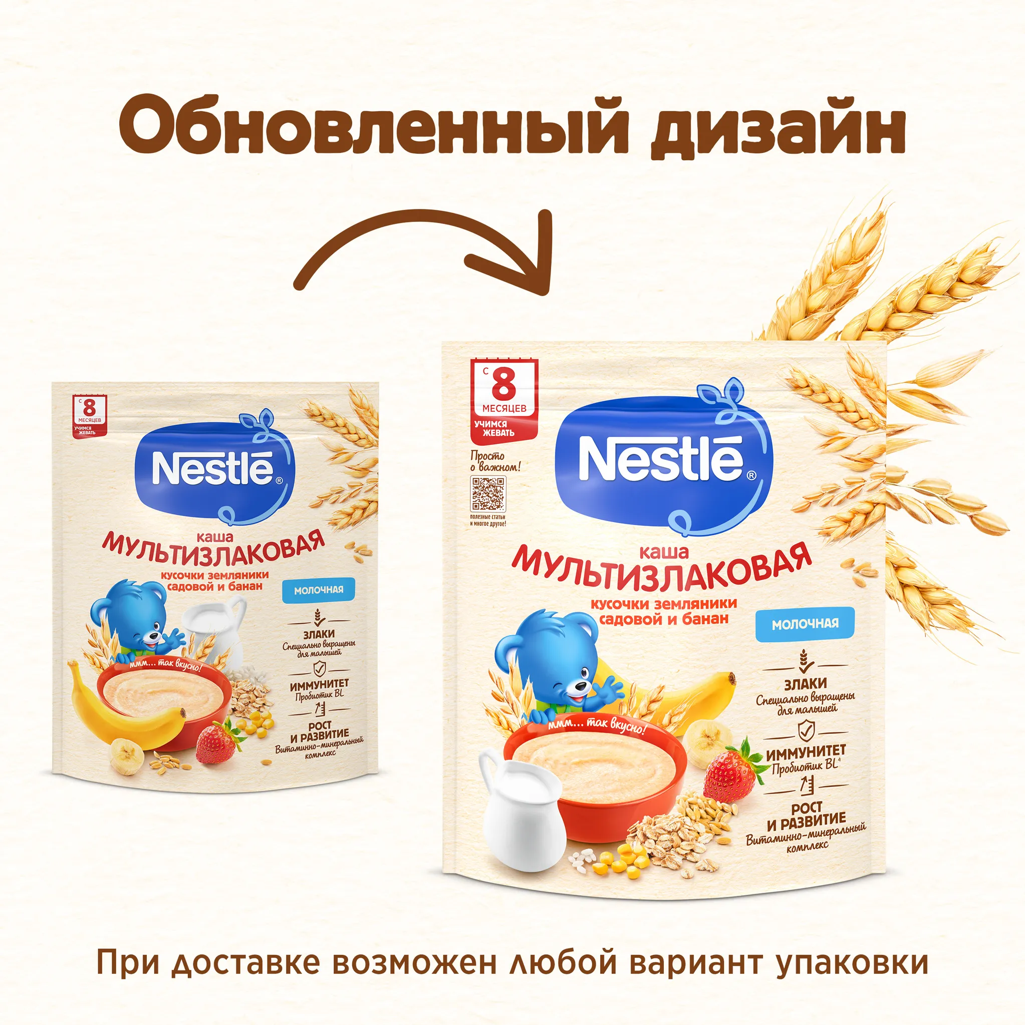 Молочная мультизлаковая каша с бананом и кусочками земляники для питания детей старше 8 месяцев согласно законодательству РФ.