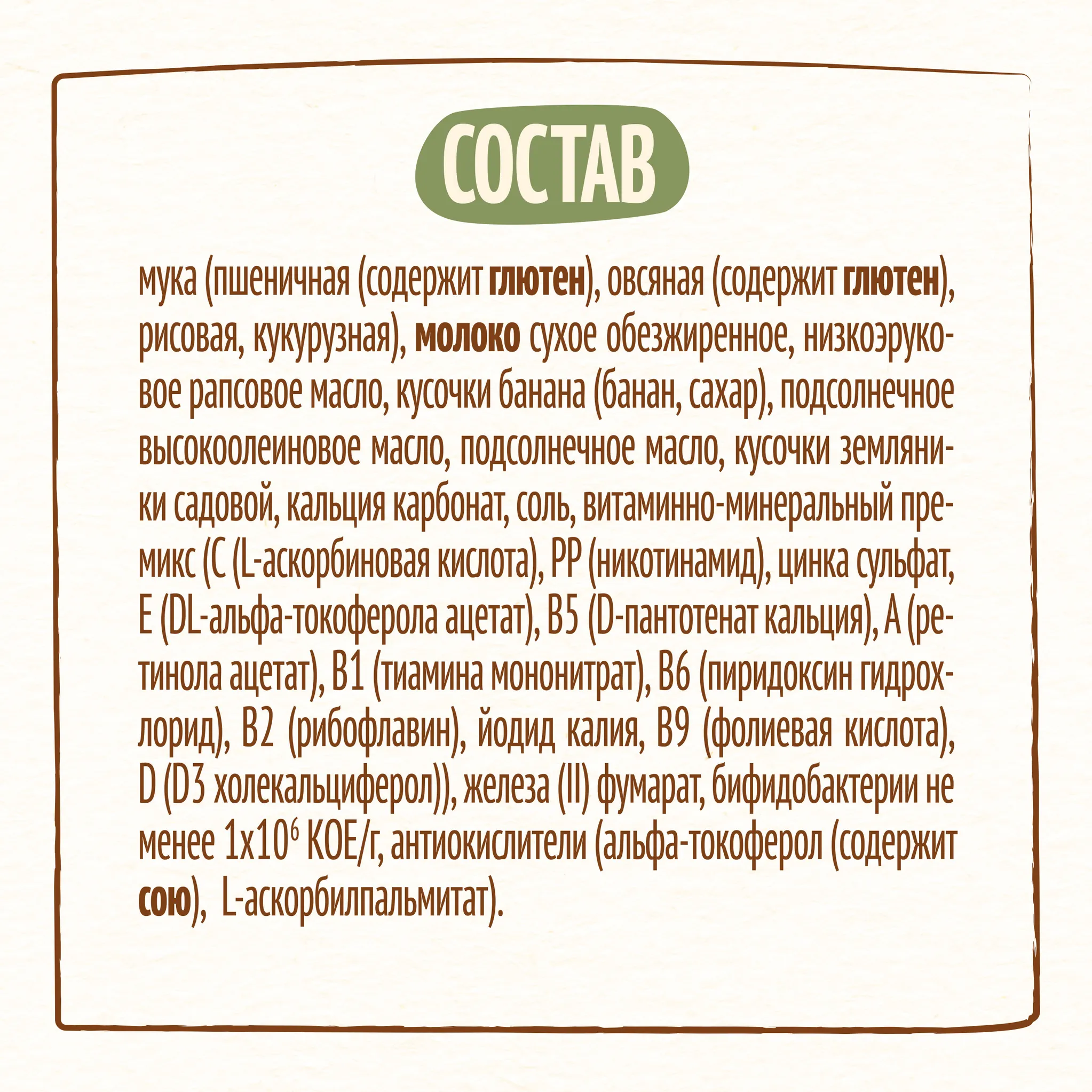 Мука (пшеничная (содержит глютен), овсяная (содержит глютен), рисовая, кукурузная), молоко сухое обезжиренное, низкоэруковое рапсовое масло, кусочки банана (банан, сахар), подсолнечное высокоолеиновое масло, подсолнечное масло, кусочки земляники садовой, кальция карбонат, соль, витаминно-минеральный премикс (С (L-аскорбиновая кислота), РР (никотинамид), цинка сульфат, E (DL-альфа-токоферола ацетат), B5 (D-пантотенат кальция), A (ретинола ацетат), В1 (тиамина мононитрат), В6 (пиридоксин гидрохлорид), В2 (рибофлавин), йодид калия, B9 (фолиевая кислота), D (D3 холекальциферол)), железа (II) фумарат, бифидобактерии не менее 1х106 КОЕ/г, антиокислители (альфа-токоферол (содержит сою), L-аскорбилпальмитат)