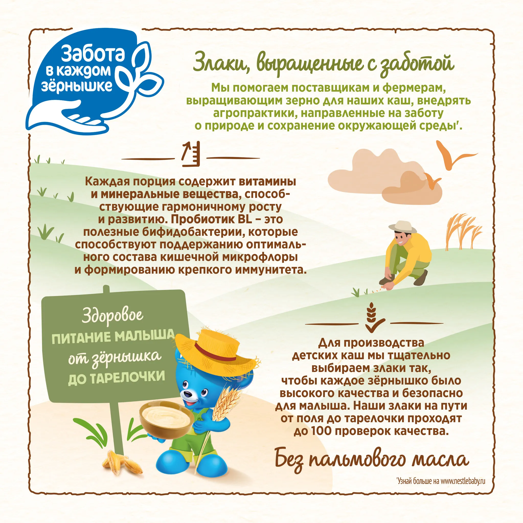 Каша Nestlé является полезным сбалансированным прикормом для здоровых детей и отлично подходит для расширения рациона. Обогащена пробиотиками - полезными бифидобактериями BL. Они способствуют нормализации пищеварения, росту здоровой микрофлоры и укреплению иммунитета, что очень важно в период прикорма. Каша содержит комплекс витаминов и минеральных веществ для гармоничного роста и развития. Добавление фруктовых кусочков способствует развитию как вкусовых восприятий малыша, так и жевательных навыков, что очень важно в период постепенного перехода к взрослому меню.