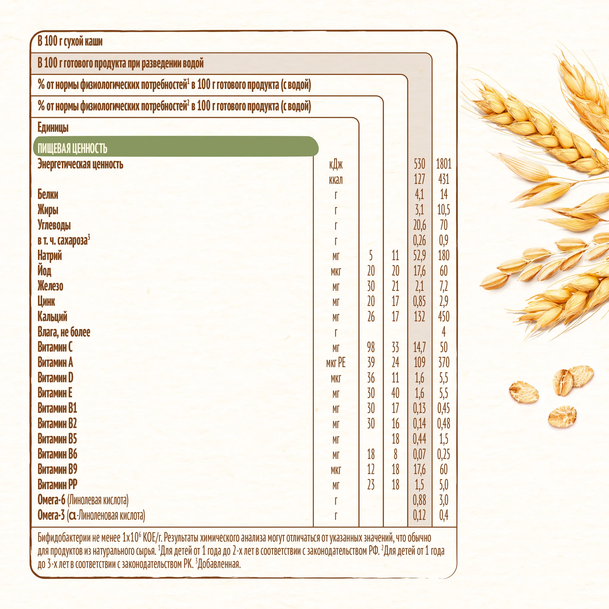Мука (пшеничная (содержит глютен), овсяная (содержит глютен), рисовая, кукурузная), молоко сухое обезжиренное, хлопья овсяные (содержат глютен), низкоэруковое рапсовое масло, подсолнечное высокоолеиновое масло, кусочки яблока, кусочки земляники садовой, подсолнечное масло, хлопья персика, кальция карбонат, соль, витаминно-минеральный премикс (С (L-аскорбиновая кислота), РР (никотинамид), цинка сульфат, E (DL-альфа-токоферола ацетат), B5 (D-пантотенат кальция), A (ретинола ацетат), В1 (тиамина мононитрат), В6 (пиридоксин гидрохлорид), В2 (рибофлавин), йодид калия, B9 (фолиевая кислота), D (D3 холекальциферол)), железа (II) фумарат, бифидобактерии не менее 1х106 КОЕ/г, антиокислители (альфа-токоферол (содержит сою), L-аскорбилпальмитат)