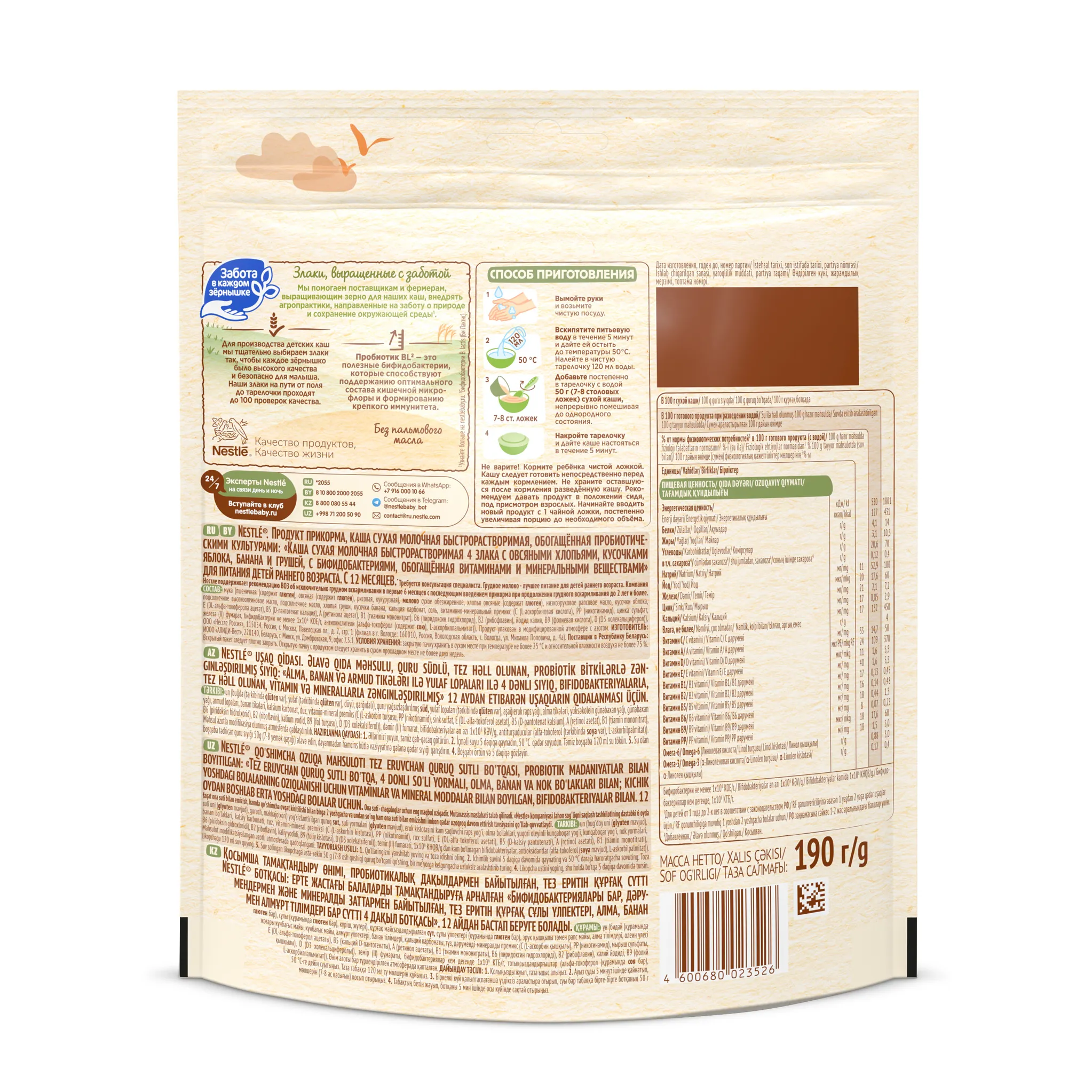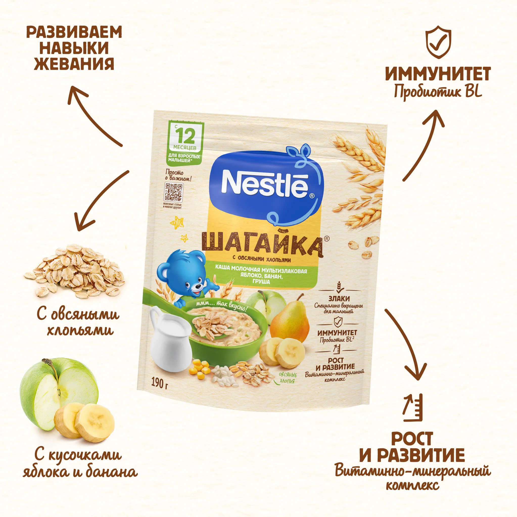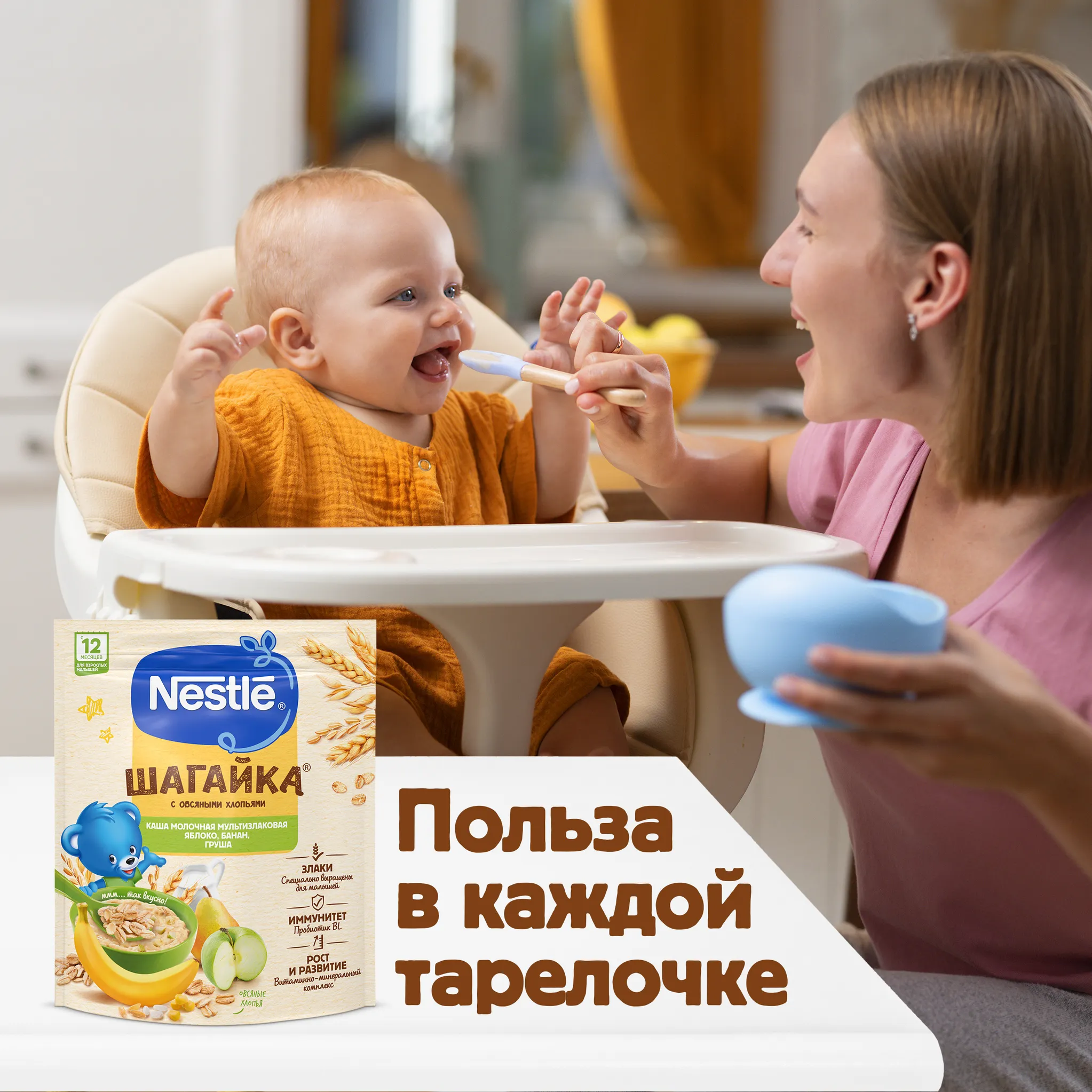 Молочная каша Nestl é Шагайка мультизлаковая с овсяными хлопьями, грушей, кусочками яблока и банана.