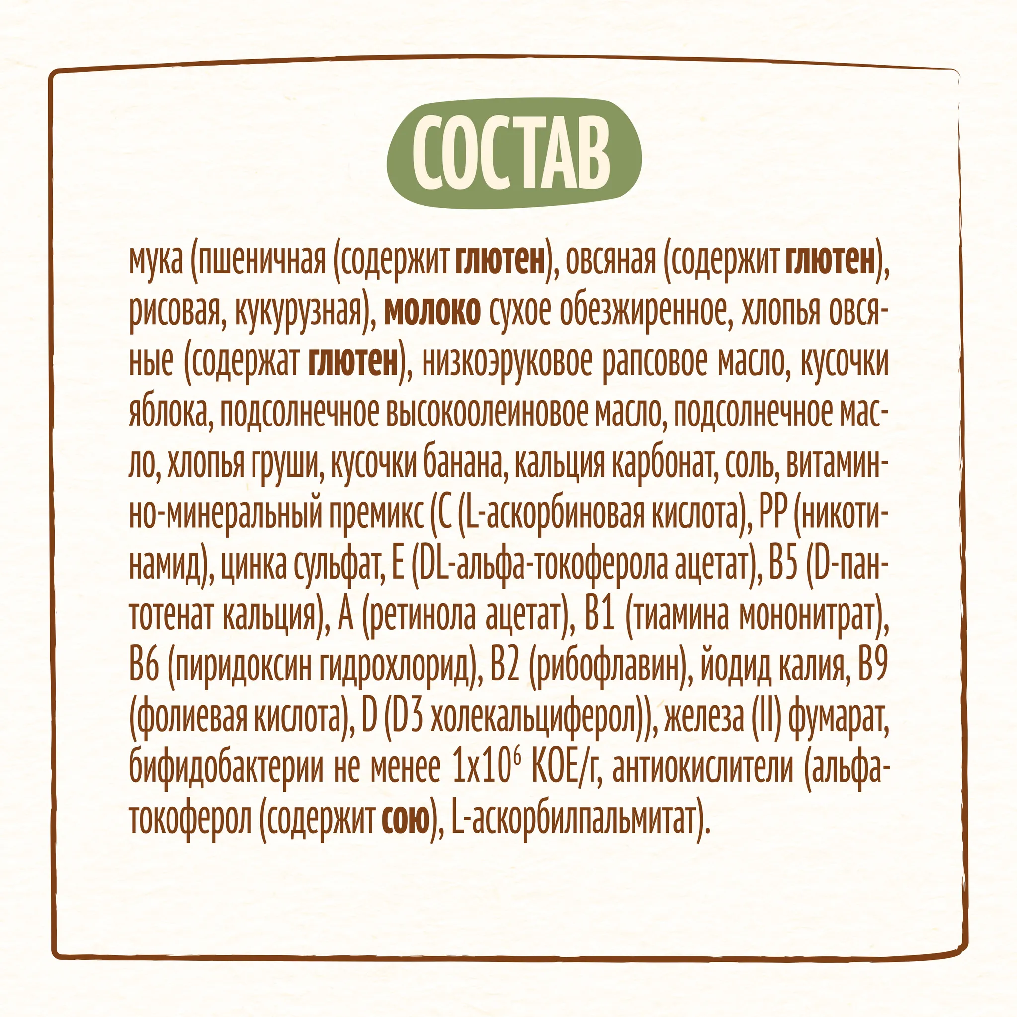 Мука (пшеничная (содержит глютен), овсяная (содержит глютен), рисовая, кукурузная), молоко сухое обезжиренное, хлопья овсяные (содержат глютен), низкоэруковое рапсовое масло, кусочки яблока, подсолнечное высокоолеиновое масло, подсолнечное масло, хлопья груши, кусочки банана, кальция карбонат, соль, витаминно-минеральный премикс (С (L-аскорбиновая кислота), РР (никотинамид), цинка сульфат, E (DL-альфа-токоферола ацетат), B5 (D-пантотенат кальция), A (ретинола ацетат), В1 (тиамина мононитрат), В6 (пиридоксин гидрохлорид), В2 (рибофлавин), йодид калия, B9 (фолиевая кислота), D (D3 холекальциферол)), железа (II) фумарат, бифидобактерии не менее 1х106 КОЕ/г, антиокислители (альфа-токоферол (содержит сою), L-аскорбилпальмитат)
